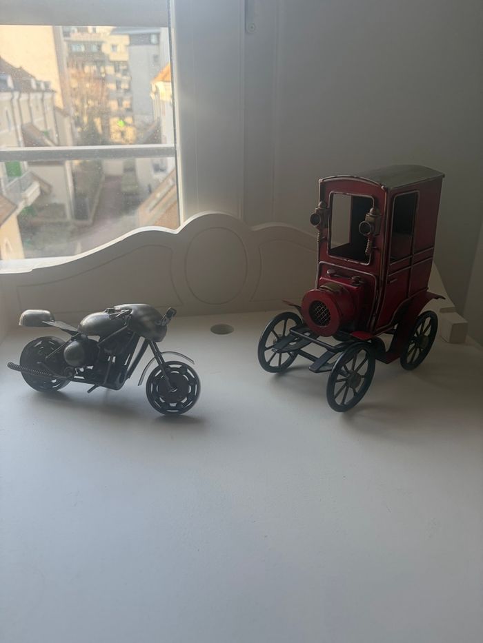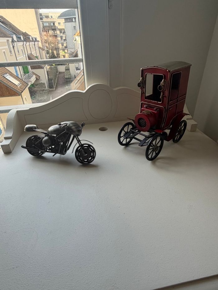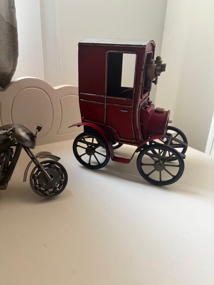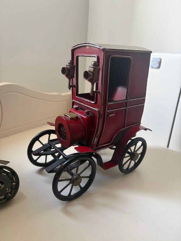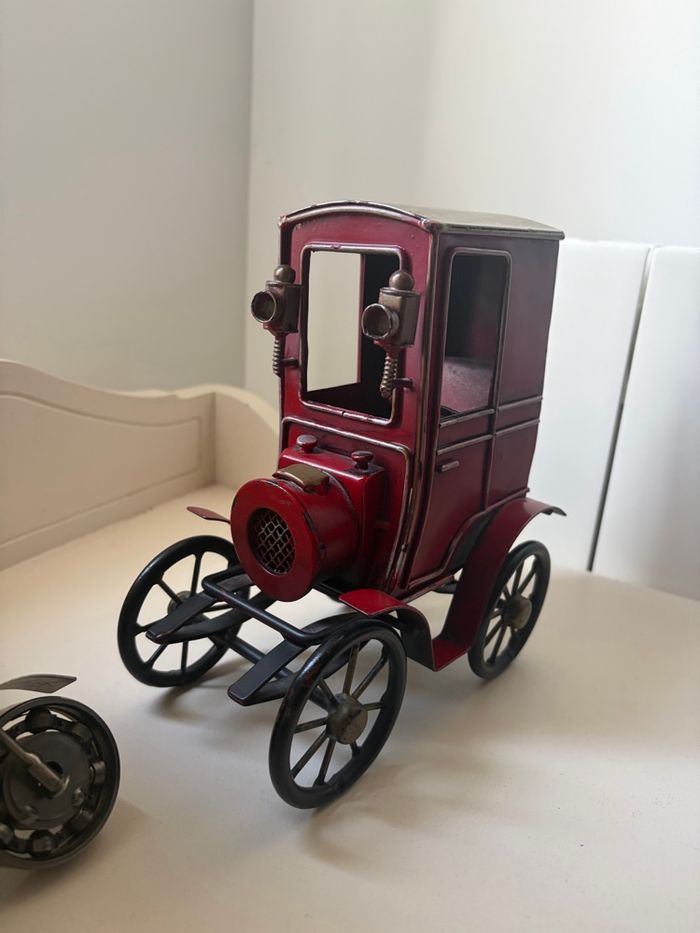 Possédez une véritable pièce d’art industriel avec ce magnifique modèle en métal fabriqué à la main d’une « voiture sans chevaux » classique du début des années 1900. Ce n’est pas un jouet en plastique : il s’agit d’une pièce décorative solide, soudée à la main, dotée d’une superbe finition rouge profond et d’un niveau de détail remarquable. Des roues à rayons aux lanternes latérales d’époque, en passant par la calandre avant en métal grillagé, chaque élément a été soigneusement assemblé pour évoquer les débuts de l’ère automobile. La finition de peinture « vieillie » lui confère un authentique caractère ancien, faisant de cette pièce un objet décoratif idéal pour un bureau, une bibliothèque ou un espace de type man cave.