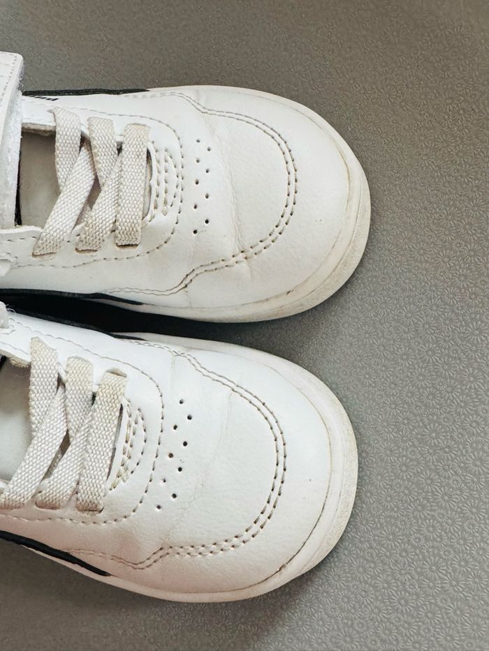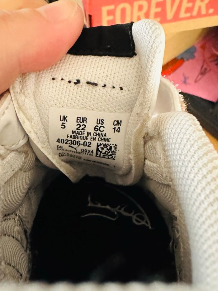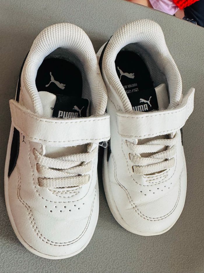 Basket Puma mixte taille 22, plutôt en très bon état (voir photos). Léger pli, dû à la marche, sur le haut des chaussures (voir photo)