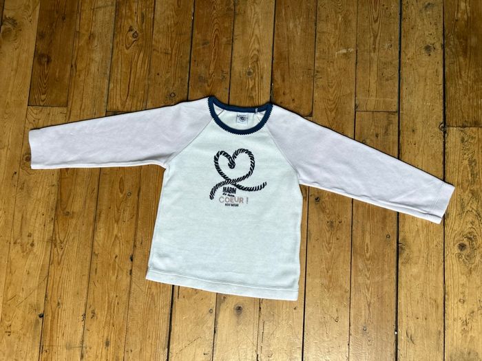 En parfait état Haut de pyjama en velours blanc rose lilas bleu marine imprimé devant noeud marin de mon cœur Taille 6 ans 116 cm 80% coton 20% polyester Petit Bateau