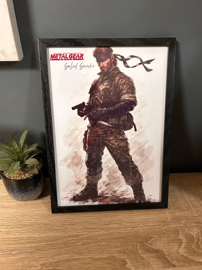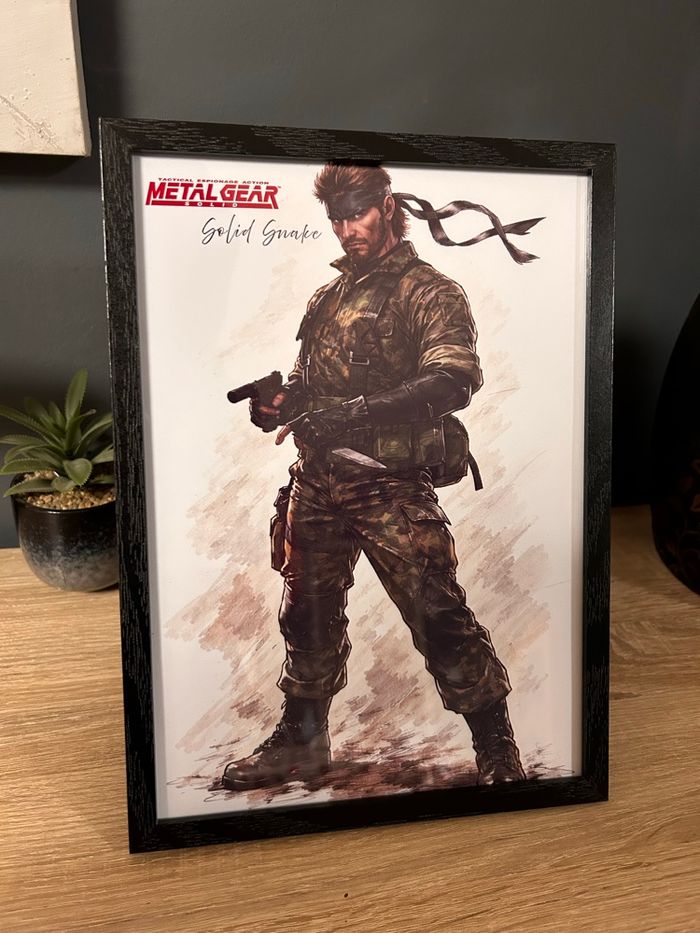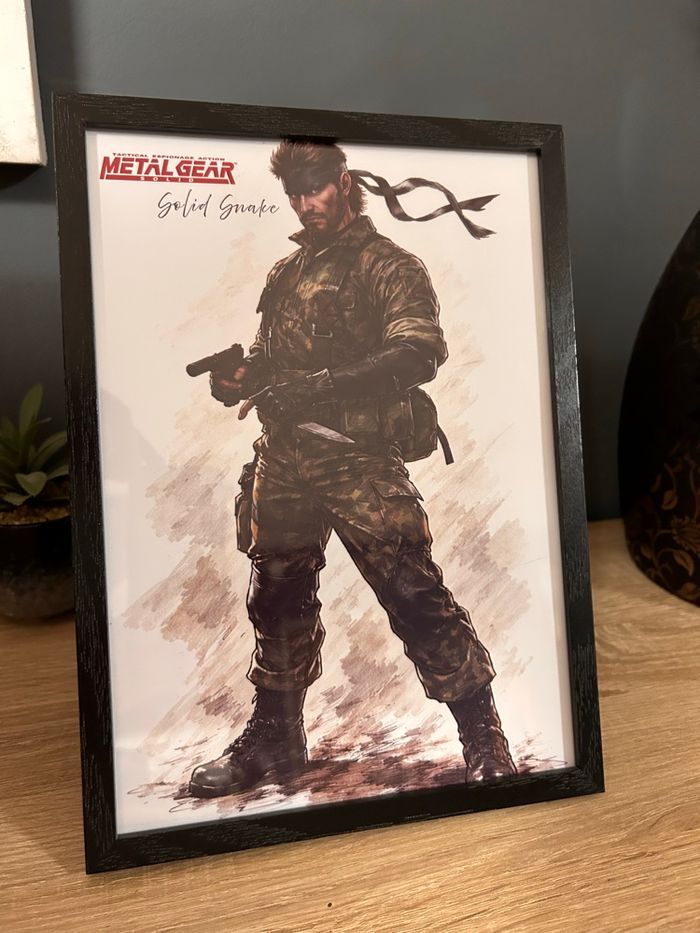 Magnifique cadre décoratif mettant en scène Solid Snake, figure culte de la saga Metal Gear Solid. Illustration au rendu artistique soigné, à la fois sobre et puissante, parfaite pour une décoration gaming, pop culture ou bureau. ✦ Caractéristiques : • Format de l’illustration : A4 • Dimensions du cadre : 23 x 31,5 cm • Cadre en bois noir • État : neuf • Belle finition, rendu très élégant une fois exposé • Remise en main propre possible • Envoi possible, emballage soigné Cadre idéal pour un fan de jeux vidéo, un collectionneur ou simplement pour apporter une touche originale et stylée à un intérieur. Disponible tant que l’annonce est en ligne.