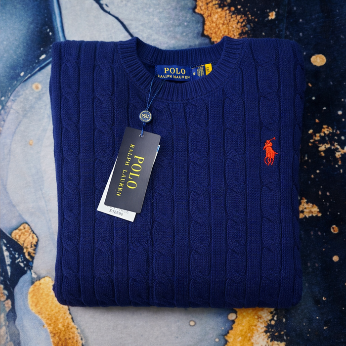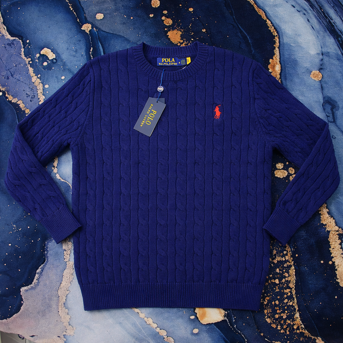 Pull Ralph Lauren Bleu Taille S col rond torsadé logo brodé rouge