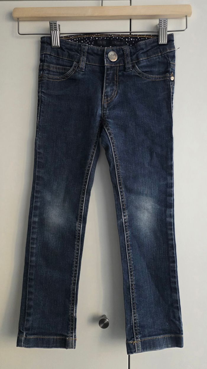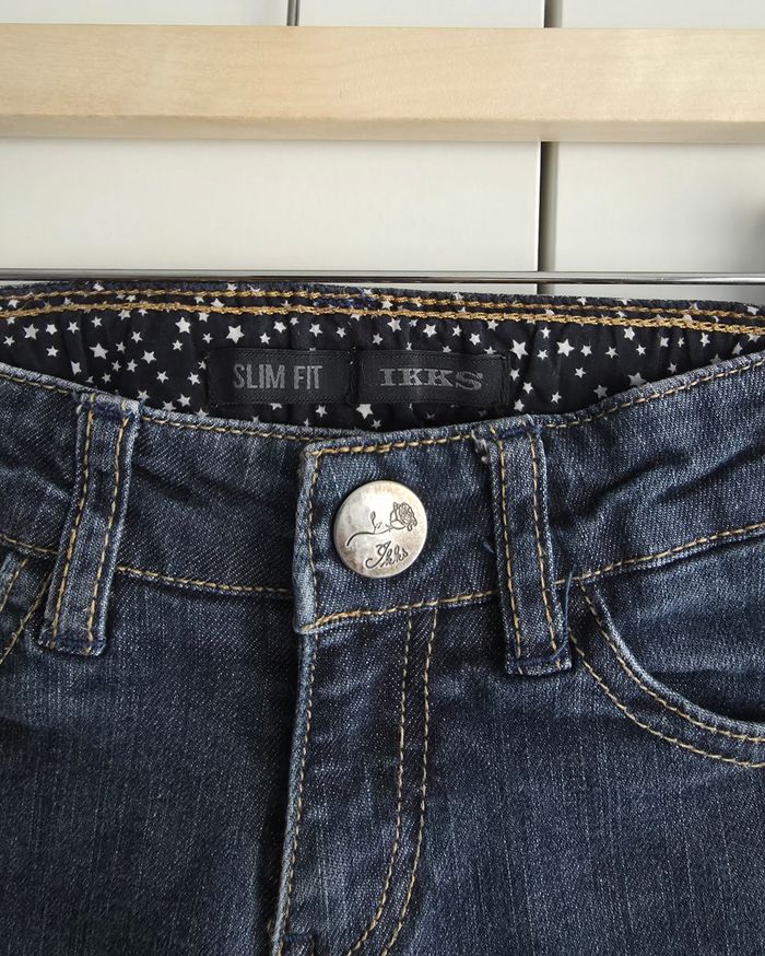 Jean de marque IKKS, taille 5 ans. Couleur bleu, 3 poches avant dont 1 poche ticket, 2 poches arrière. Passant pour ceinture, taille ajustable.