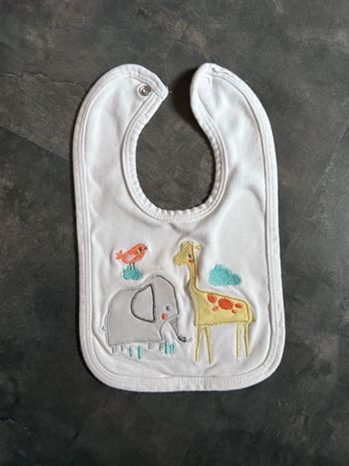 Bavoir coton blanc broderie animaux girafe éléphant oiseau Fermeture par pression