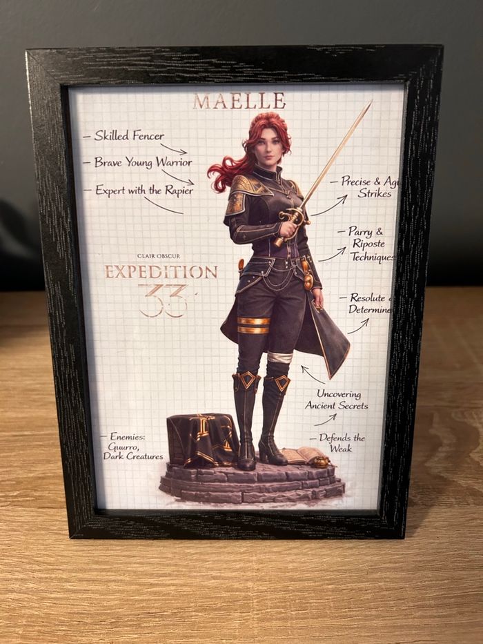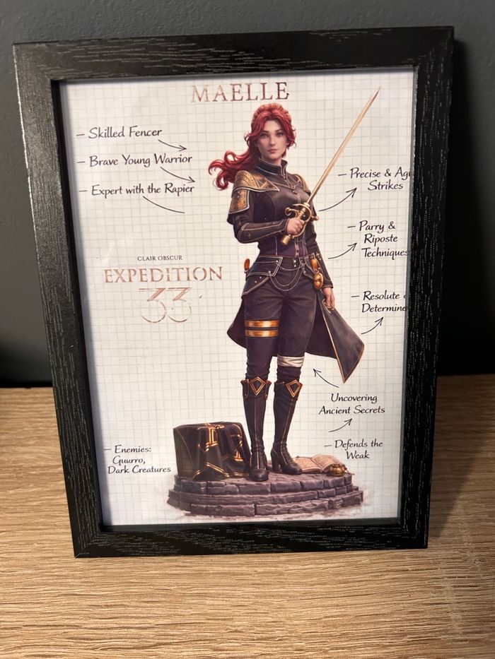 Cadre décoratif Maelle, personnage de l’univers Clair Obscur : Expedition 33. Illustration au style croquis / fiche de personnage, avec annotations manuscrites, imprimée en haute qualité et montée dans un cadre en bois noir sobre et élégant. 🖼️ Détails : • Format image : 13 × 18 cm • Cadre : bois noir, vitre plastique • État : neuf • Style : fantasy / jeu vidéo / illustration artistique Idéal pour une déco gaming, fantasy ou bureau, ou pour offrir 🎁 D’autres personnages et modèles disponibles sur le profil. Envoi soigné et rapide 📦 N’hésite pas à me contacter pour un modèle ou personnage précis.