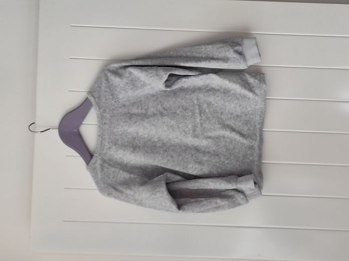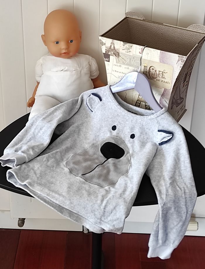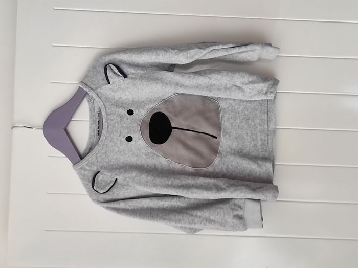 "Haut de pyjama pour garçon, taille 4 ans. En velours doux, confortable et chaud, parfait pour les nuits fraîches. Joli motif tête d’ours sur le devant 🐻 🔹 Couleur : gris 🔹 Matière : velours 🔹 État : très bon état ➡️ À noter : quelques petites bouloches autour des poignets, visibles de près mais n’altèrent pas l’usage ni le confort."