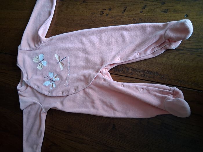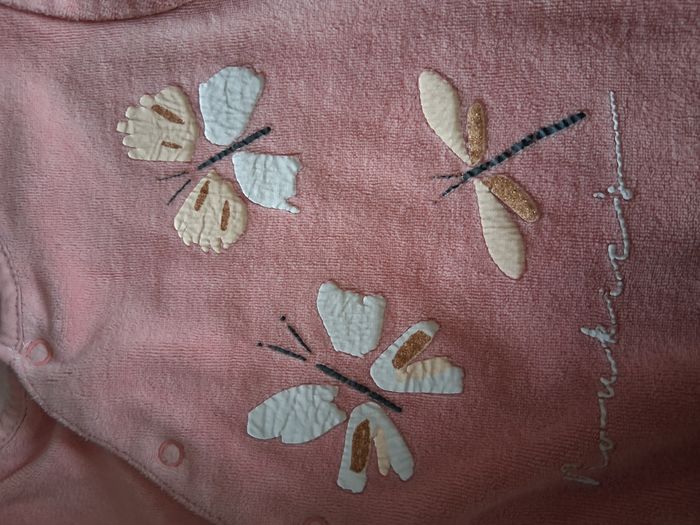 Pyjama en velours rose, motifs libellules et papillons avec ouverture par devant de marque Noukie’s Couleur : rose 70% coton 30 % polyester Lavage à 30° et séchage en machine autorisé Taille : 12 mois (80cm)