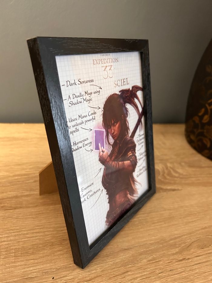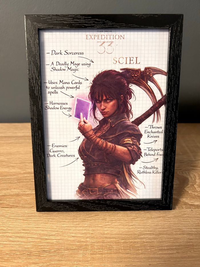 Cadre décoratif Sciel, personnage issu de l’univers Clair Obscur : Expedition 33, dans un style illustration fantasy / carnet d’exploration avec annotations manuscrites. 🔹 Illustration imprimée sur papier de qualité 🔹 Cadre en bois noir, sobre et élégant 🔹 Format 13 × 18 cm 🔹 Idéal pour déco gaming, fantasy, RPG, bureau ou étagère 🔹 Très bon rendu visuel, détails nets et contrastés ➡️ Parfait pour les amateurs d’univers sombres, artistiques et narratifs. 📐 Caractéristiques • Personnage : Sciel • Univers : Clair Obscur – Expedition 33 • Format image : 13 × 18 cm • Cadre : Bois noir • État : Très bon état • Vendu avec cadre 📦 Envoi 📮 Envoi soigné et rapide 📦 Cadre protégé pour le transport