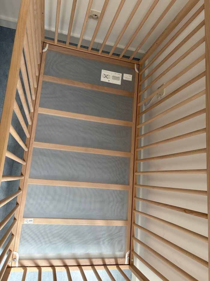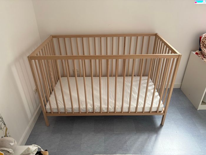 Lit à barreaux utilisé 2 mois, en excellent état. Modèle SNIGLAR IKEA, bois hêtre. 2 hauteurs de sommiers disponibles. (Guide de montage dispo sur le site IKEA) Clé Allen taille standard pour les vis. Vendu avec matelas 120x60cm en excellent état également. Possibilité d’enlever la housse du matelas pour lavage. À venir chercher sur place PAS DE LIVRAISON