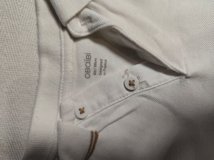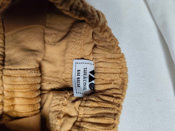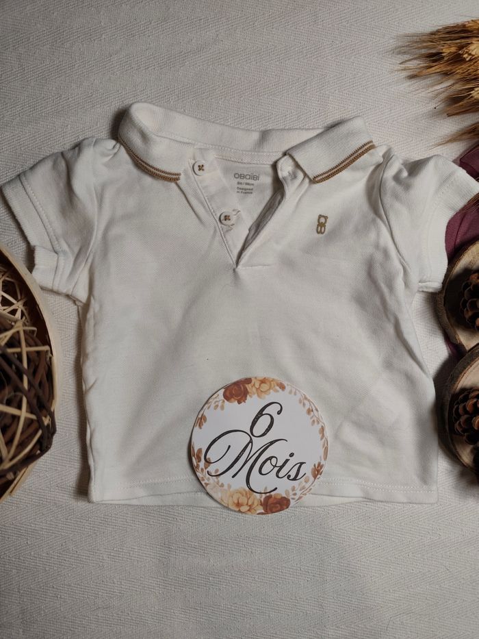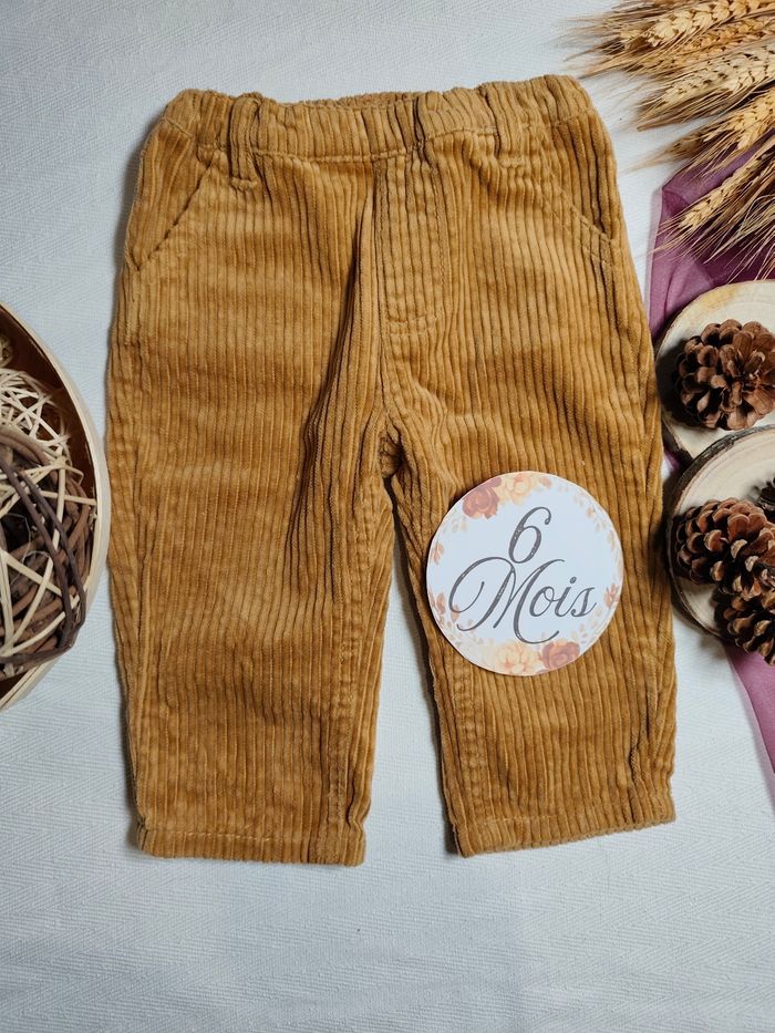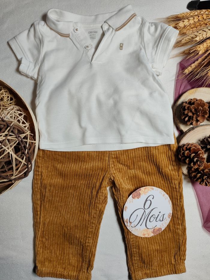 👕 Polo OBAIBI : Blanc immaculé avec finitions camel sur le col et logo brodé. Très élégant. 👖 Pantalon TAPE À L'OEIL : En velours côtelé couleur moutarde. Une couleur chaude et tendance, avec une coupe super confortable pour bébé. ✅ État : Comme neuf ! Chaque pièce a été lavée et soigneusement repassée (le velours est impeccable).