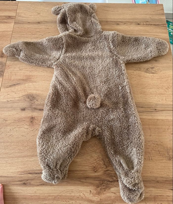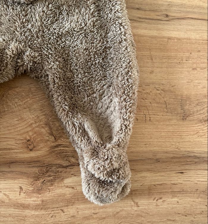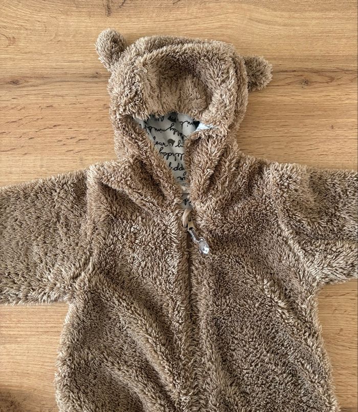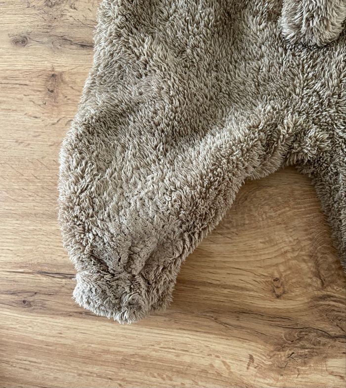 Combo pilote fermeture éclair capuche Petit ourson marron Traces d’usures sur le poil derrière les pieds et capuche (photos à l’appui) Sinon en excellent état Taille 4-6 mois