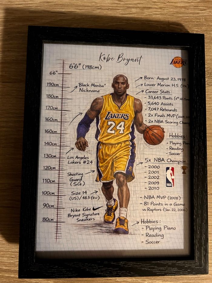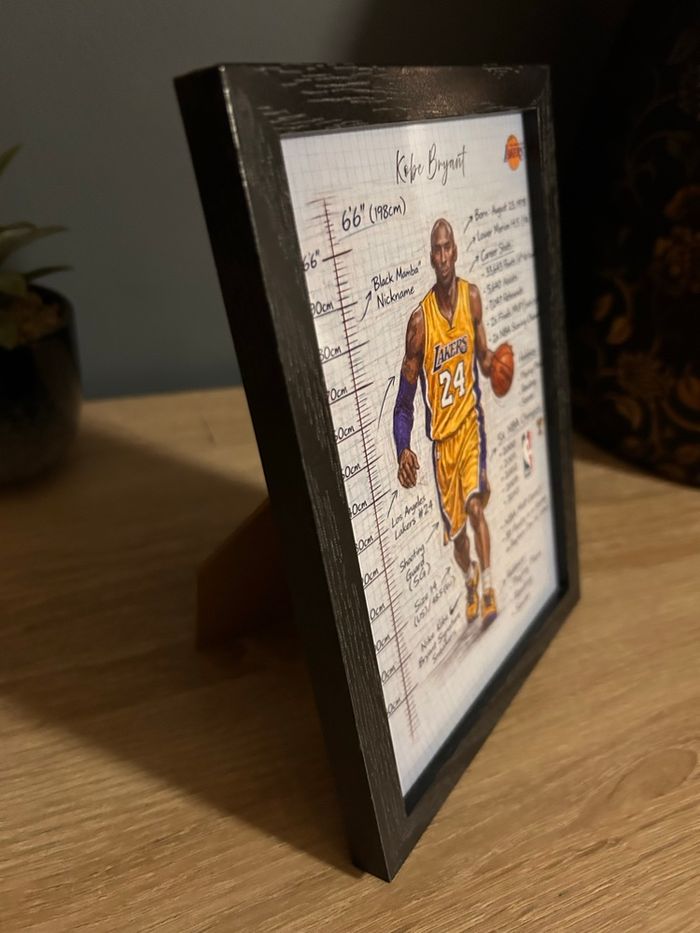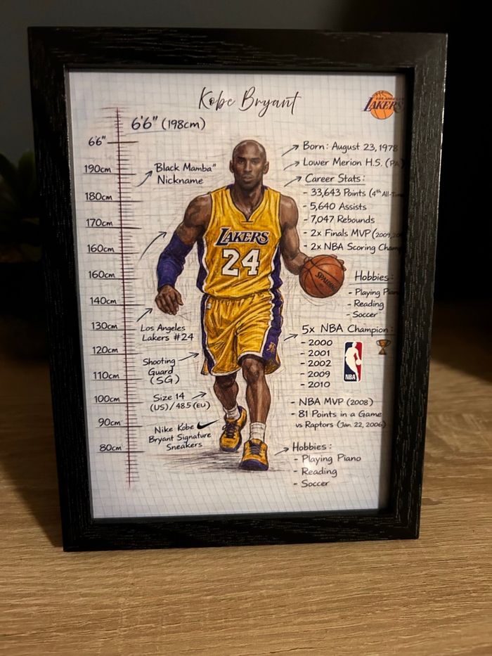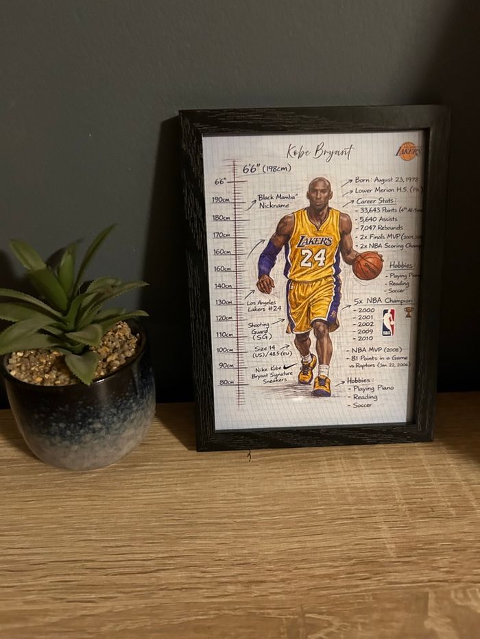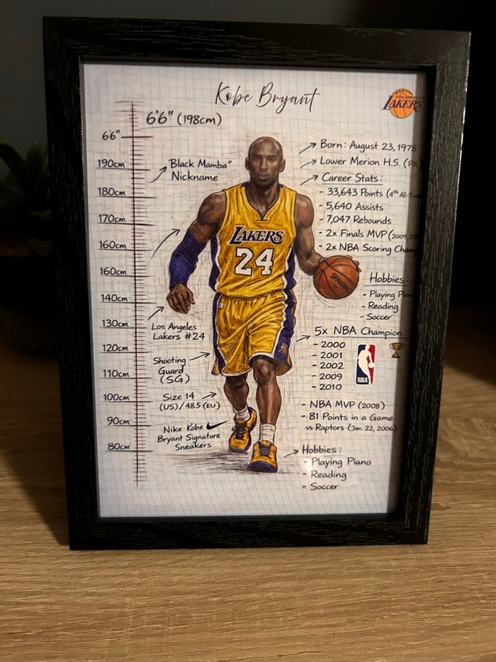 Cadre décoratif 13 x 18 cm, cadre en bois noir, illustrant Kobe Bryant dans un style dessiné / croquis, avec informations visuelles autour de sa carrière NBA. Pièce décorative discrète et soignée, parfaite pour les amateurs de basket, de sport et de décoration murale ou de bureau. • Format : 13 x 18 cm • Cadre : bois noir • État : neuf • Article vendu tel que sur les photos Livraison soignée et rapide