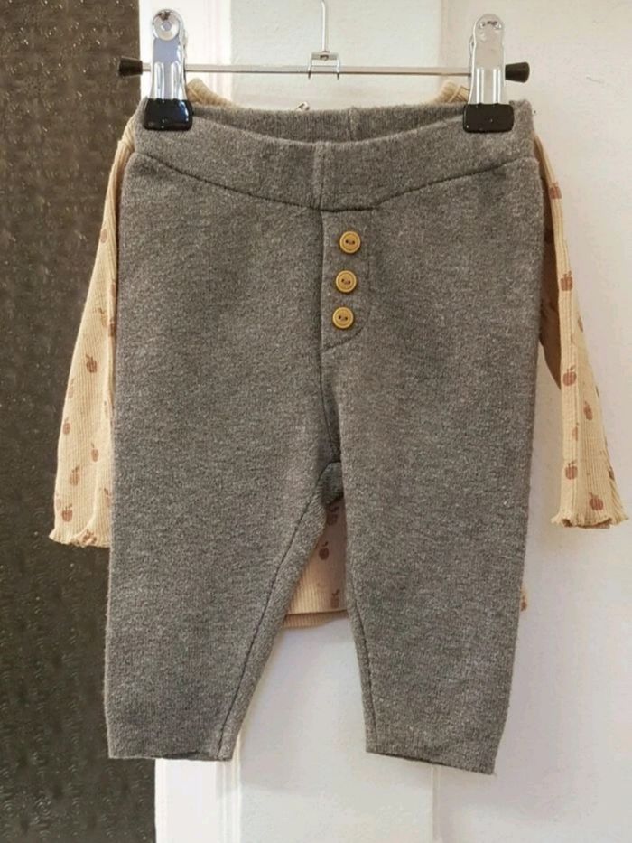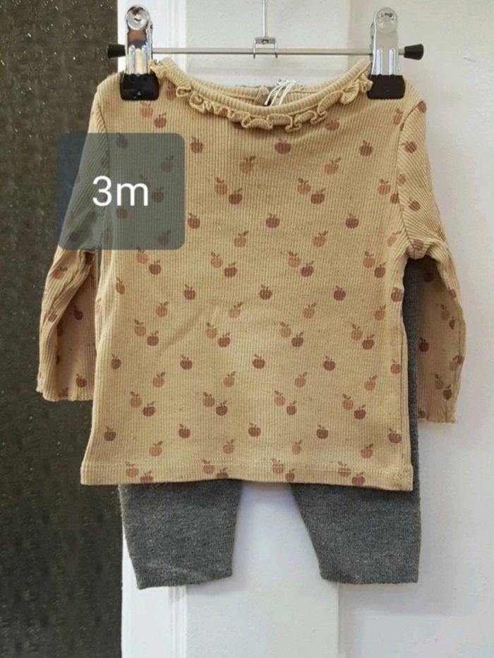 Lot de 2 articles : pantalon chaud et doux gris + tshirt manches longues vieux rose à motifs fruits, très bon état, pas de tâches ou trous, envoi soigné. Kiabi - 3 mois