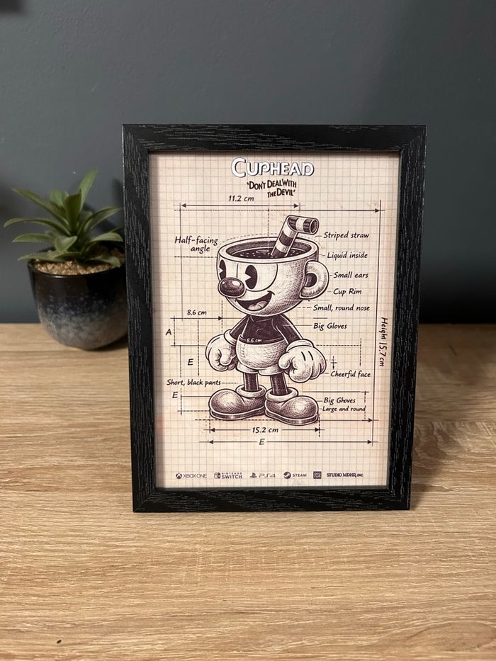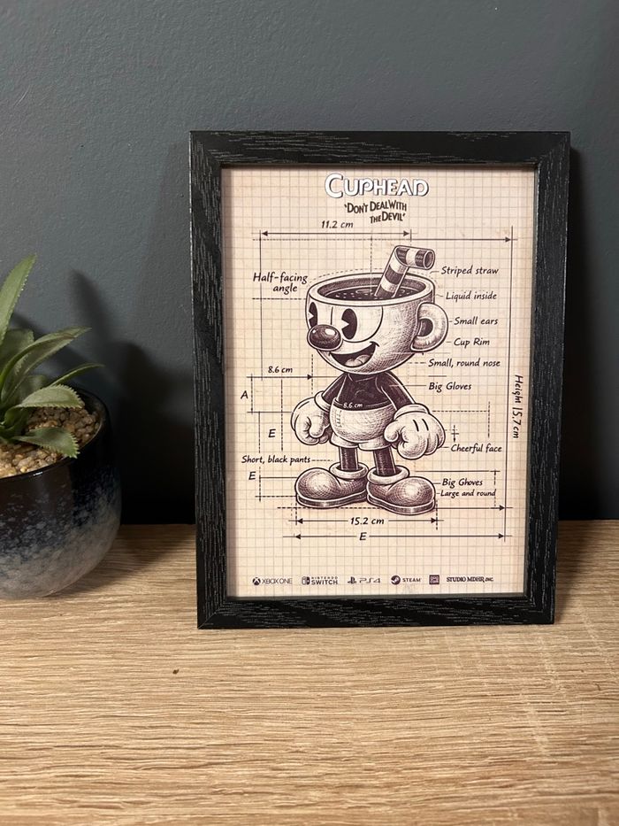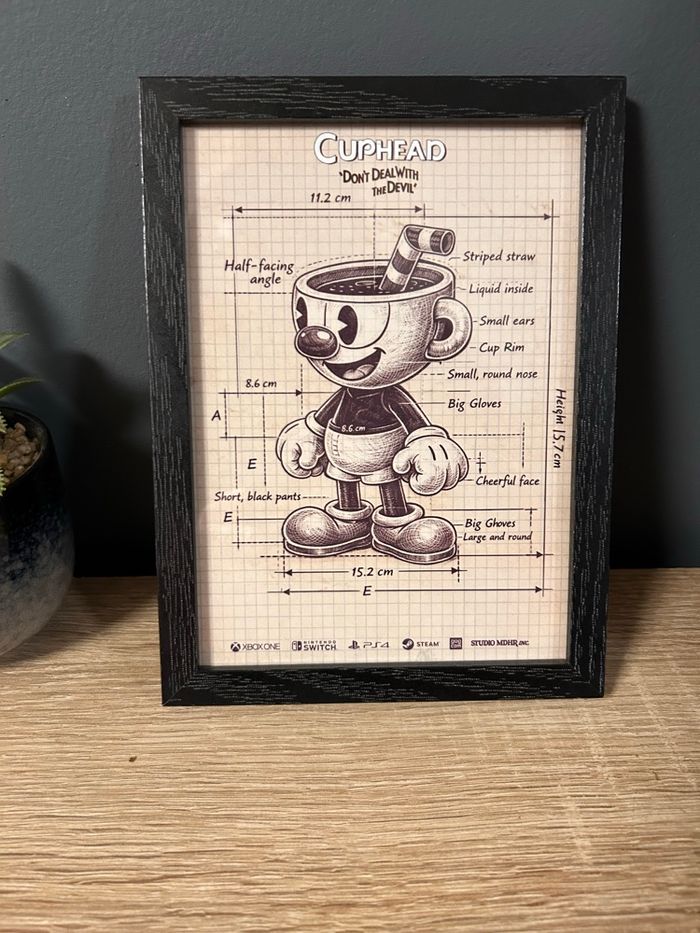 Cadre décoratif représentant Cuphead, issu du jeu culte Cuphead: Don’t Deal With the Devil, illustré sous forme de croquis technique détaillé sur fond papier quadrillé. Le visuel reprend un style dessin technique / carnet de conception, avec annotations, mesures et détails du personnage, idéal pour les amateurs de rétro-gaming et de direction artistique vintage. Caractéristiques : • Personnage : Cuphead • Style : croquis technique / blueprint rétro • Format : 13 x 18 cm • Cadre : bois noir • Impression nette, bien centrée • Pose sur meuble ou accrochage mural • État : neuf Parfait pour une décoration gaming, un bureau, une gaming room ou pour offrir à un fan de Cuphead.