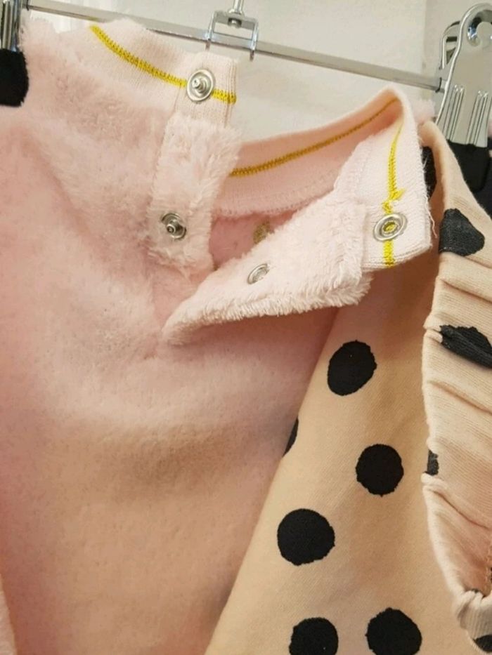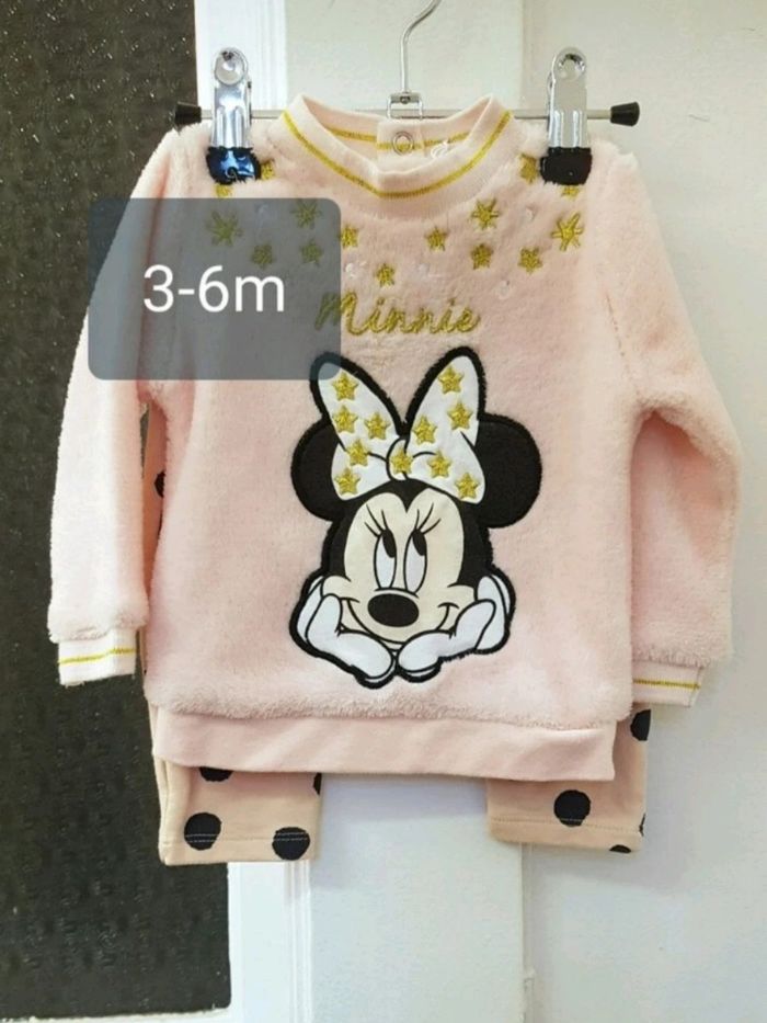 Jogging 2 pièces Minnie Disney Baby, Pull matière moumoute rose pâle imprimé Minnie, pressions au dos + bas de jogging rose à pois noir taille élastique, très bon état, pas de tâches ou trous, envoi soigné. Disney Baby Orchestra, 6 mois