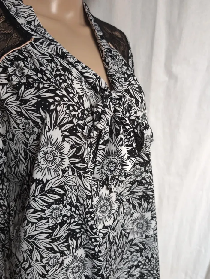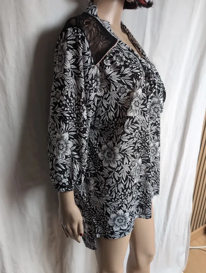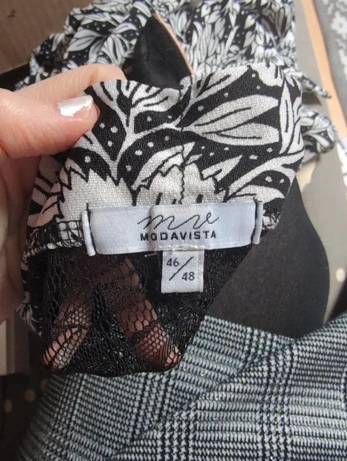 Blouse élégante de la marque Modavista, mêlant noir et blanc avec un joli motif fleurs et feuilles. Les empiècements en dentelle sur les épaules et le haut du dos apportent une touche féminine et raffinée, idéale pour une tenue chic tout en restant confortable. ⚠️ À noter : • Présence d’un défaut de fabrication : une tache blanche de teinture sur la dentelle (voir photo). ➡️ Défaut purement esthétique, n’empêchant pas le port du vêtement. ✨ Détails du produit : • Marque : Modavista • Taille : 46 – 48 (#vavaneva46 #vavaneva48) • Couleurs : noir et blanc • Motifs fleurs et feuilles • Dentelle sur les épaules et le haut du dos • Coupe agréable et facile à porter 📦 Envoi rapide et soigné ❌ Maison non-fumeur #blouse #Modavista #dentelle #fleurs #femme #mode #grandetaille #vavaneva46 #vavaneva48 #occasion #secondevie