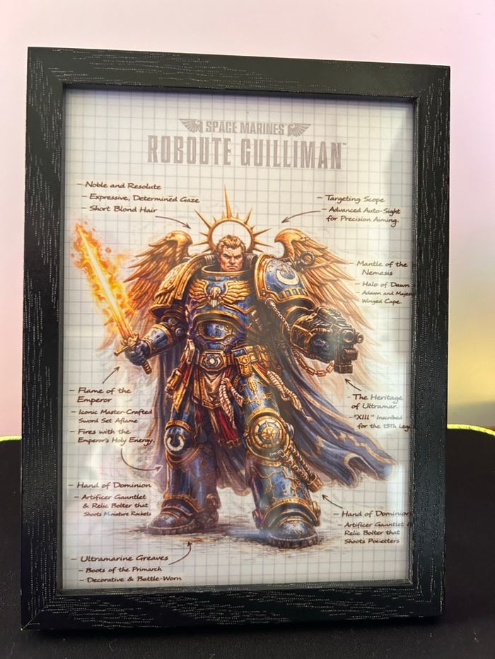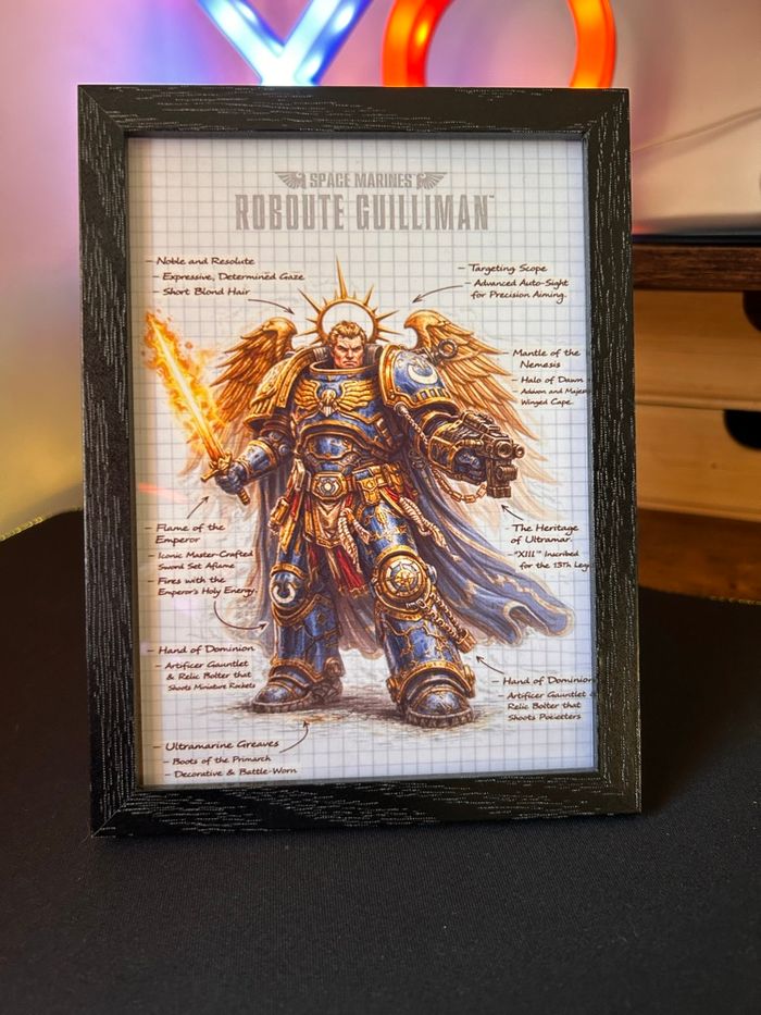 🔹 Illustration style croquis technique sur fond papier quadrillé 🔹 Détails annotés façon concept art / carnet de designer 🔹 Représentation iconique du Primarque des Ultramarines 🔹 Ambiance Warhammer 40K, noble et épique 🖼️ Cadre fourni : • Cadre en bois noir • Vitre de protection • Prêt à être accroché (attache au dos – voir photo) 📐 Dimensions : • 13 × 18 cm • Orientation : verticale ✨ Idéal pour : • Fans de Warhammer 40K • Collectionneurs • Décoration gaming / bureau / setup • Cadeau original et stylé 📦 Envoi soigné et protégé 📸 Photos réelles de l’objet 📬 Envoi rapide