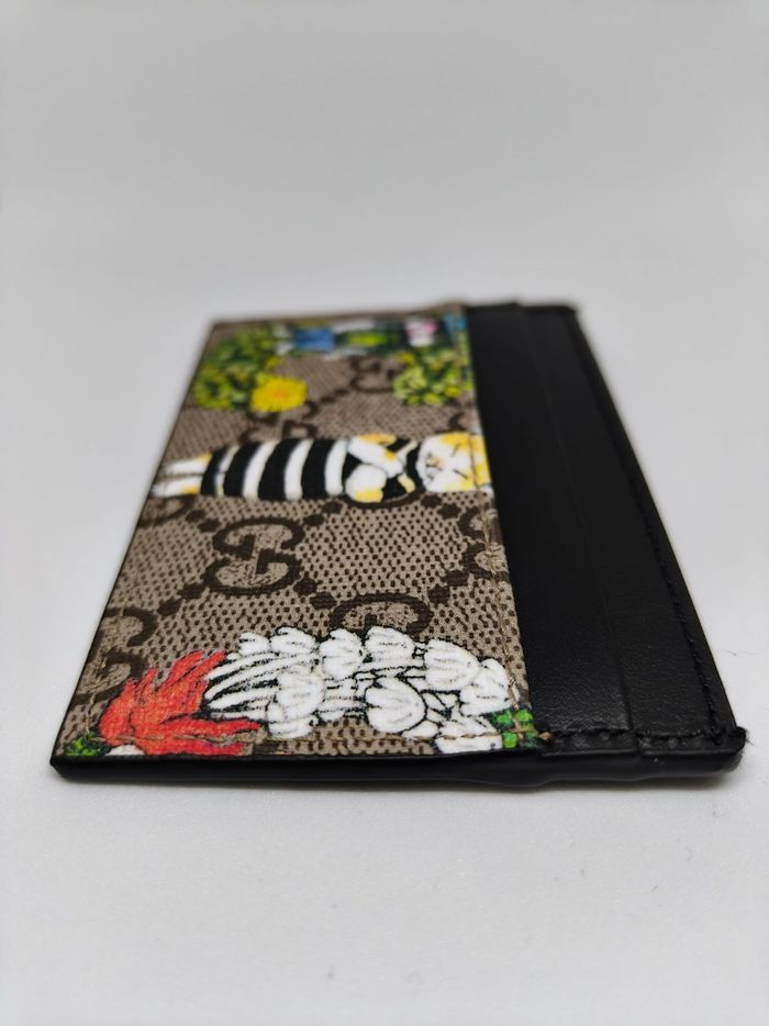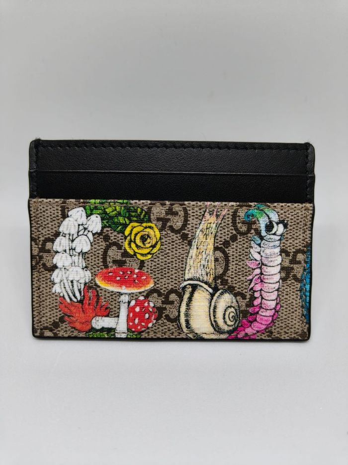 Porte-cartes Gucci GG avec imprimé illustré multicolore (inspiration nature / fantaisie), authentique. Modèle original et recherché, parfait pour celles et ceux qui souhaitent une pièce Gucci qui sort de l’ordinaire tout en restant élégante. ✔️ Article authentique Gucci ✔️ Très bon état général ✔️ Toile GG avec finitions cuir noir ✔️ Marquage intérieur Gucci visible (voir photos) ✔️ Modèle issu du circuit outlet ✔️ Envoi rapide et soigné 📦 Idéal pour cartes, billets et usage quotidien. Disponible pour toute question 🙂