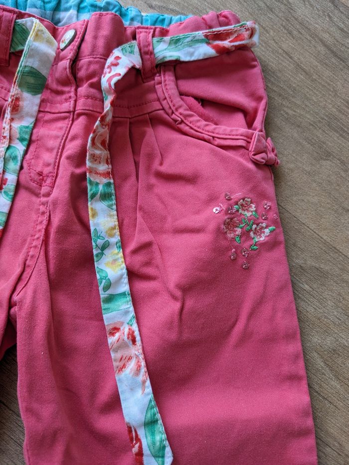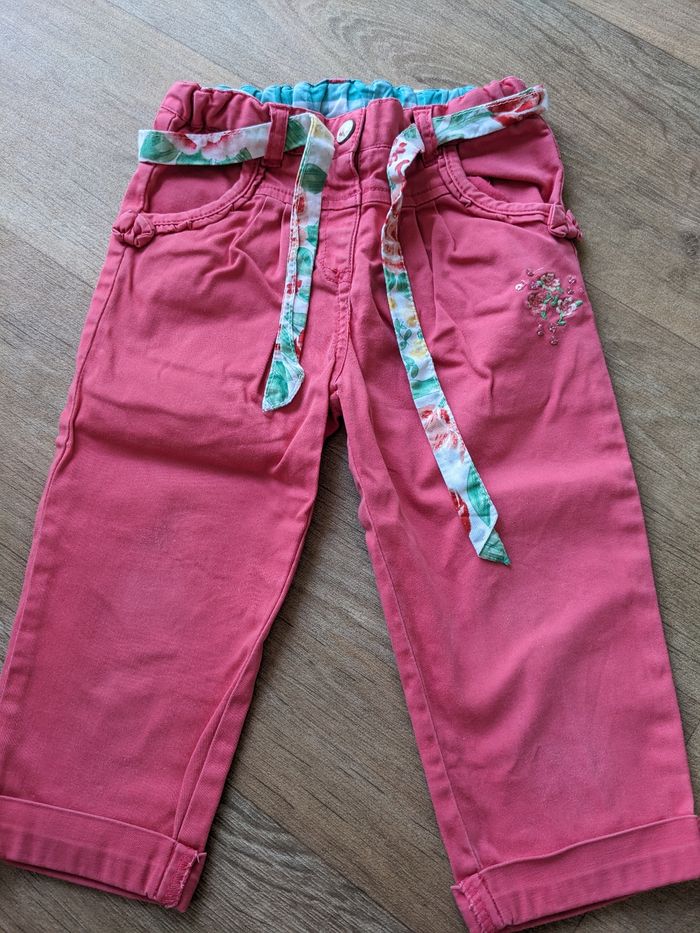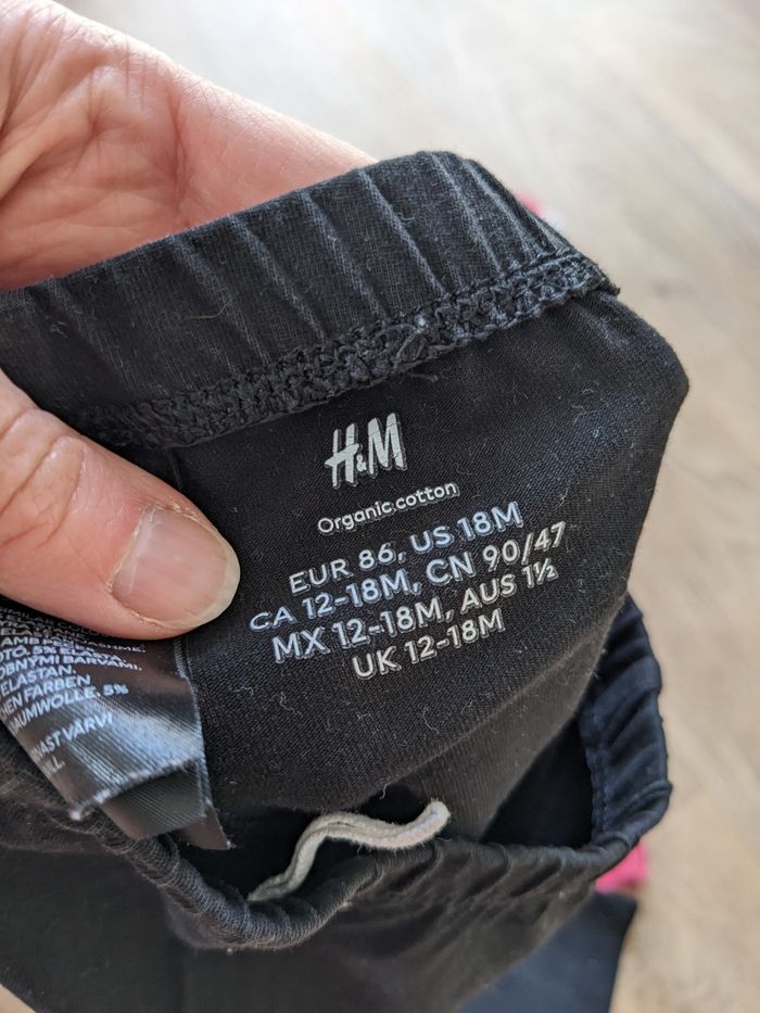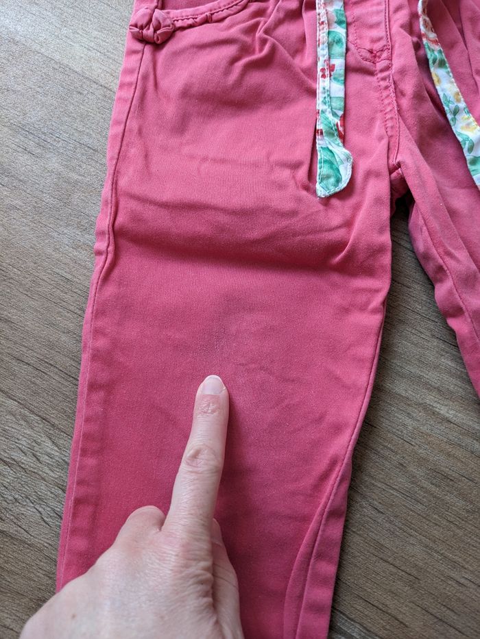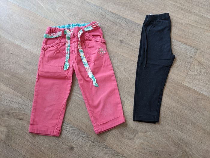 Pantalon sergent major 18 mois (mis de 18 à 36 mois !) très jolie avec sa ceinture et son petit motif en bas d'une poche. Petite trace du jour sur les genoux voir photos, mais pas de trop ni tâches Legging coton bio h&M 12-18 mois. noir. taille grand. très peu servi, très bon état