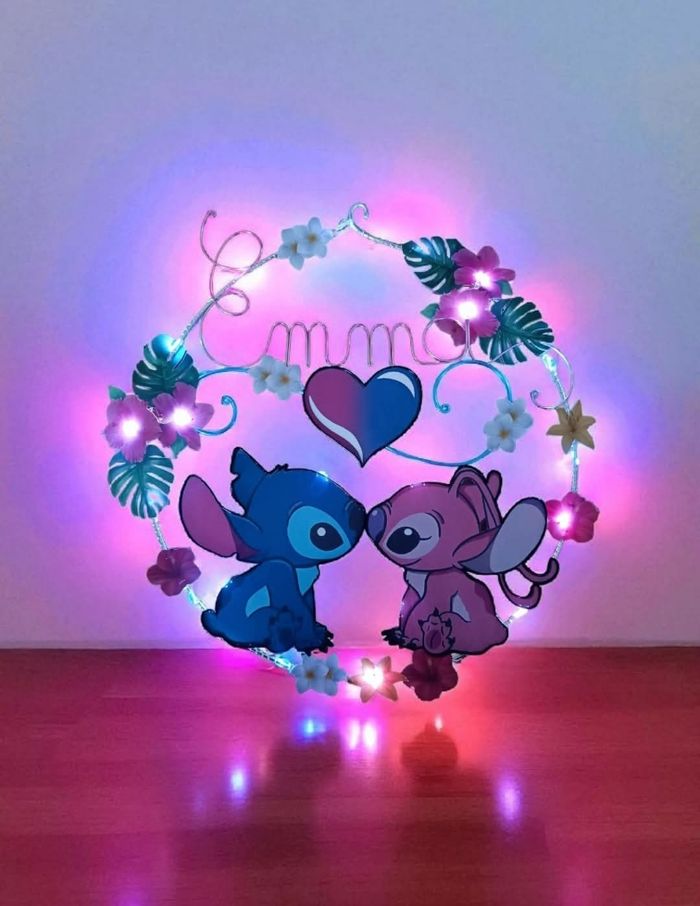 Cercle lumineux veilleuse personnalisée. Les LEDs fonctionnent a piles grâce à un petit boitier avec interrupteur caché derrière. Aucun fil apparent. Le cercle mesure environ 23-25 cm de diamètre. Mily