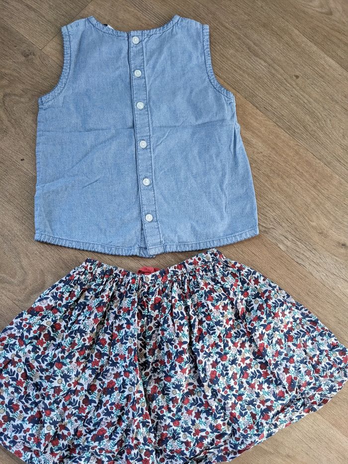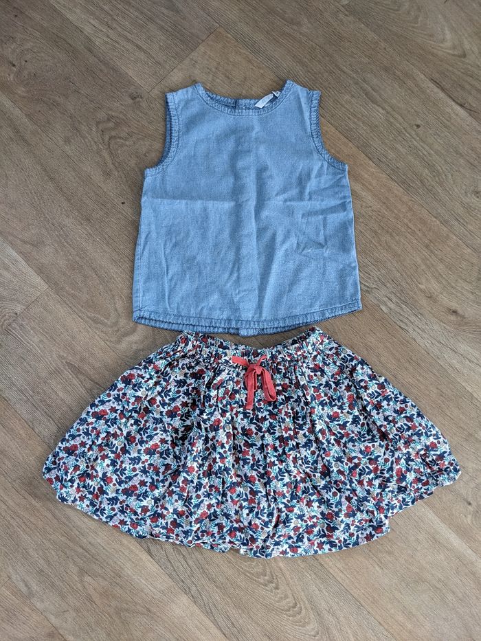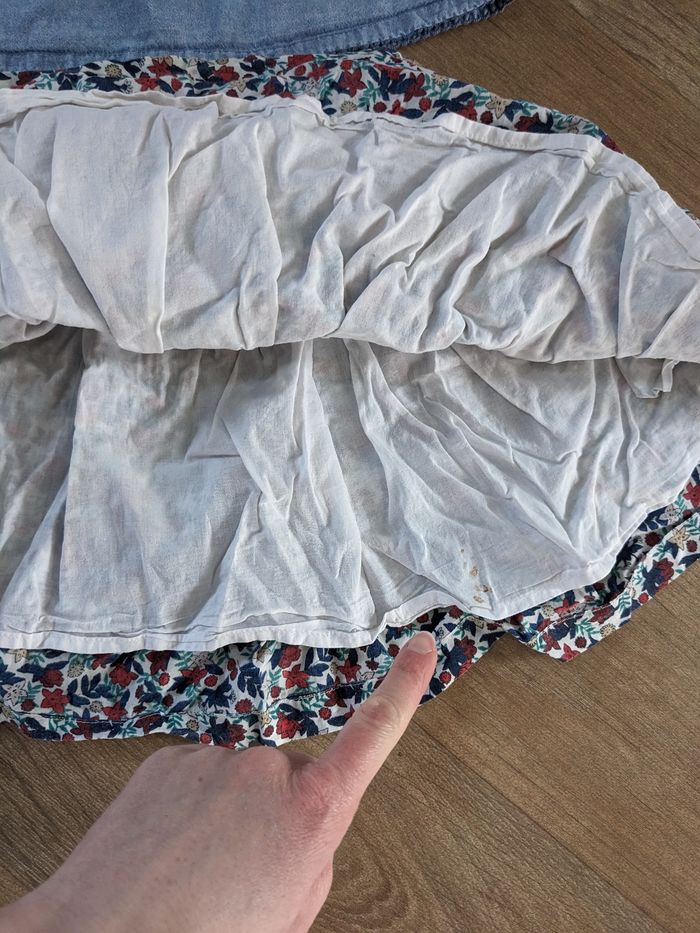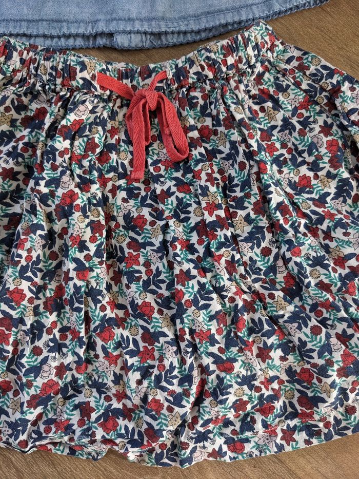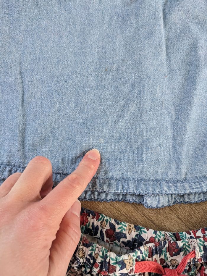 Un haut jean h&M 4-5 ans. Micro tâches voir photos mais ça ne se voit pas porté. Une jupe Monoprix coton bio 4-5 ans. Motif fleuri, élastique et lien de serrage qui fonctionnent, très bon état uniquement tâche sur la doublure intérieure voir photos