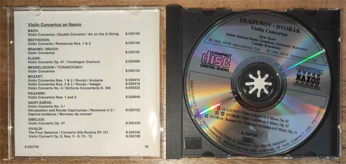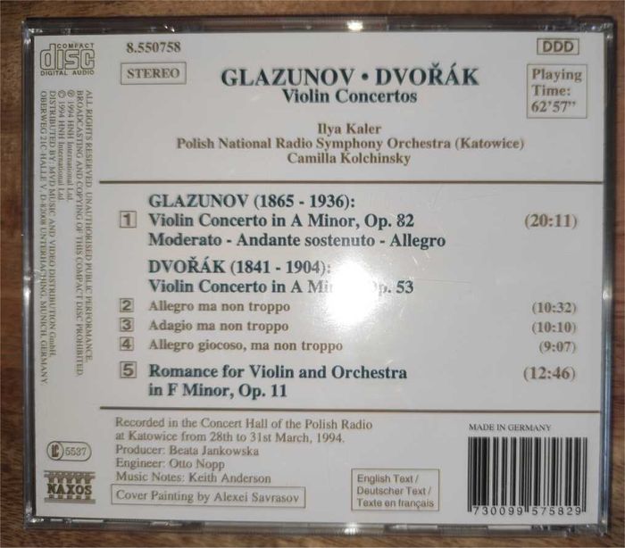 Glazunov - Dvorak - Violin Concertos CD Réf. Naxos 8.550758 Genre classique 🎵 Alexander Glazunov 1 - Violin Concerto In A Minor, Op. 82 Moderato - Andante Sostenuto - Allegro 🎵 Antonin Dvorak Violin Concerto In A Minor, Op. 53 2 - Allegro Ma Non Troppo 3 - Adagio Ma Non Troppo 4 - Allegro Giocoso, Ma Non Troppo 5 - Romance For Violin And Orchestra In F Minor, Op. 11 .