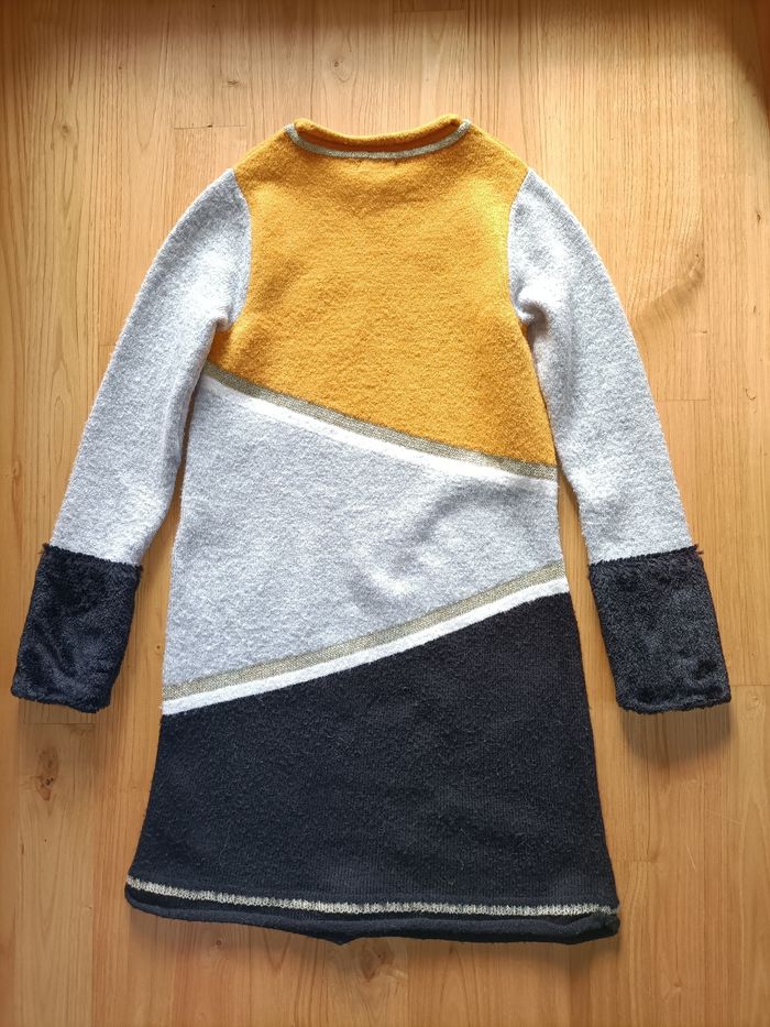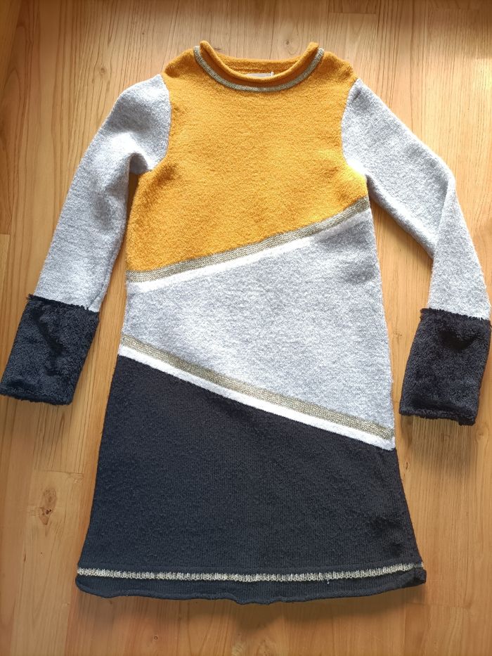 Robe pull pour fille Taille 8 ans Orchestra Motifs géométriques moutarde, gris, noir et dorés manches longues avec bout des manches en fausse fourrure Bien chaude très bon état Envoi possible