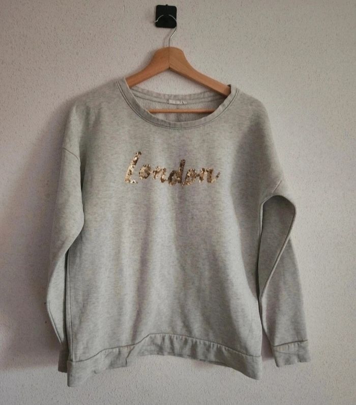 Sweat gris chiné Cache Cache “London” à sequins – taille L – très bon état - photo numéro 1