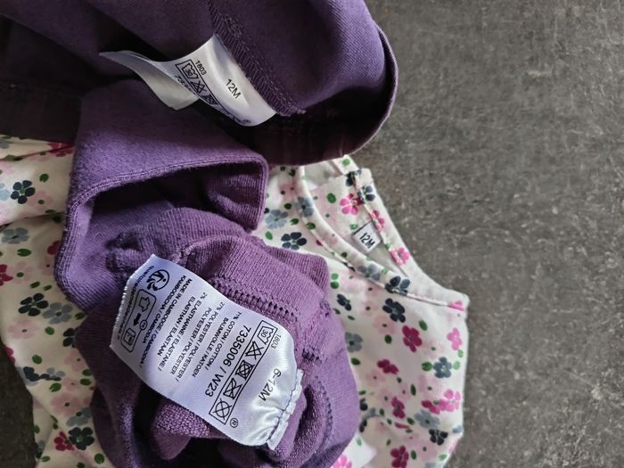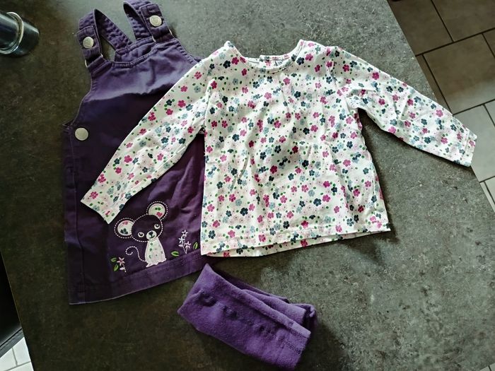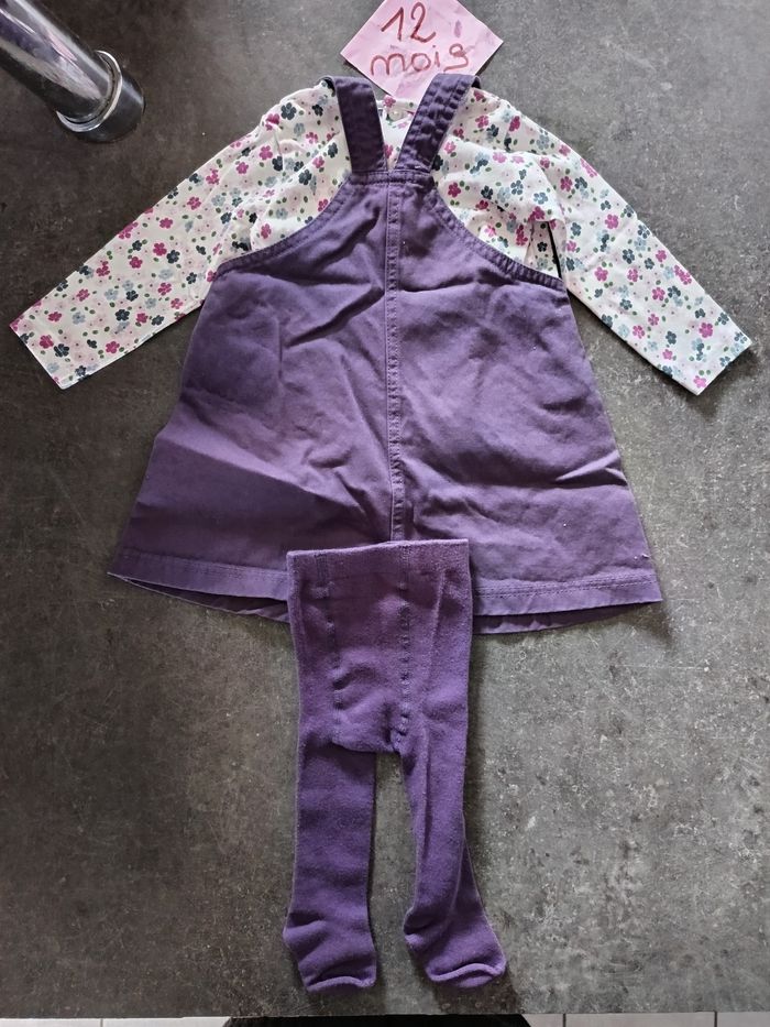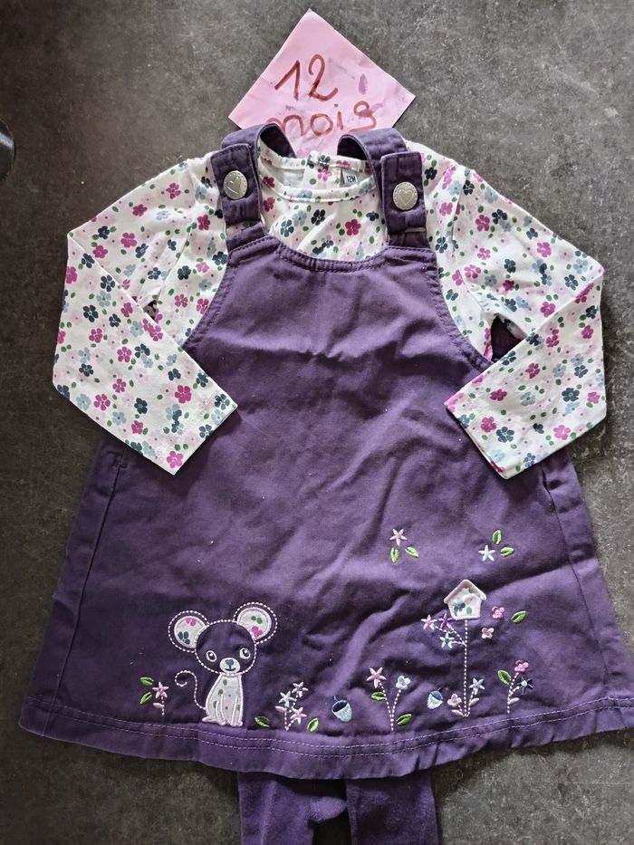 Ensemble 3 pièces : - 1 robe salopette violette avec petite souris et fleurs - 1 t-shirt fleuri manches longues - 1 collant violet NEUF jamais porté ! Taille 12 mois