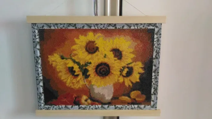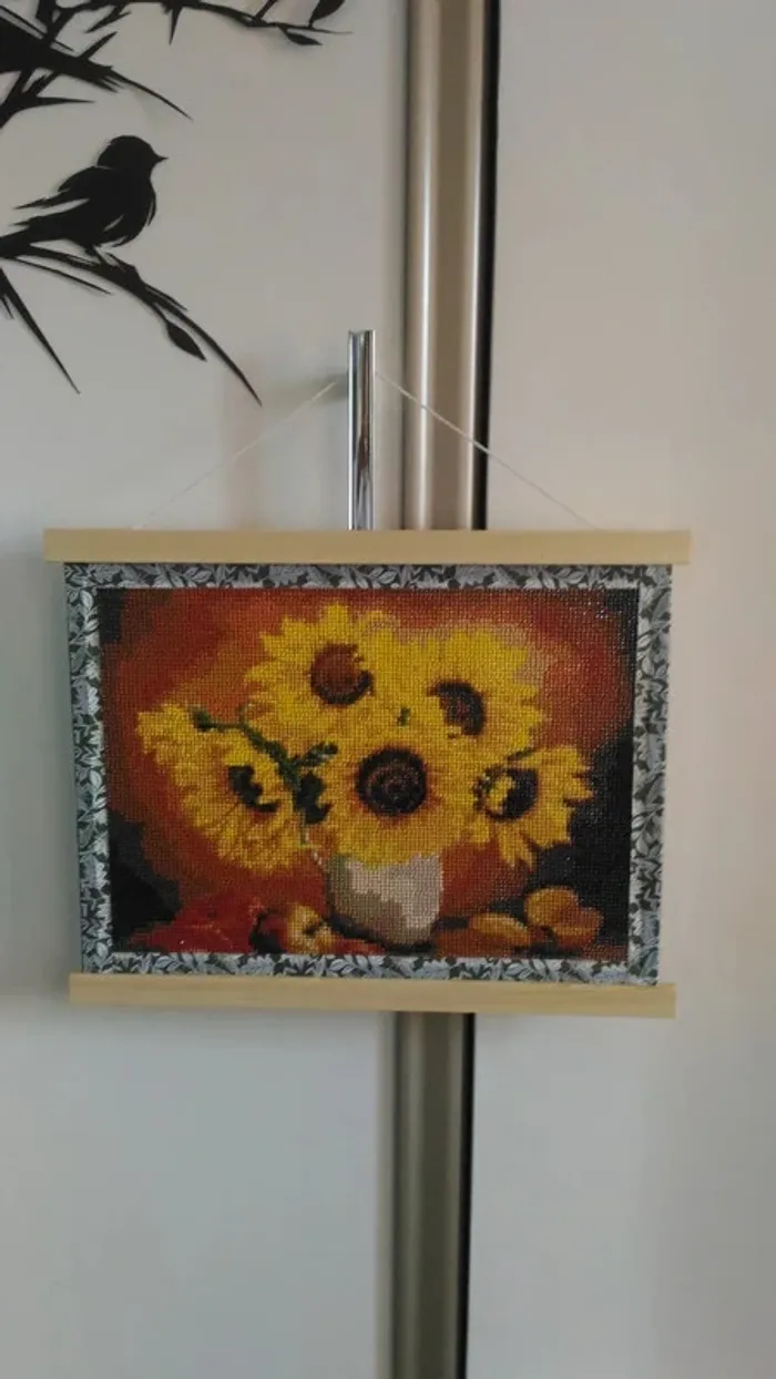 Tableau bouquet tournesols en diamants painting prêt à pendre diamants scellés pour éviter le décollement cadre à pendre en bois collé sur support rigide tour du cadre fait avec washi tap