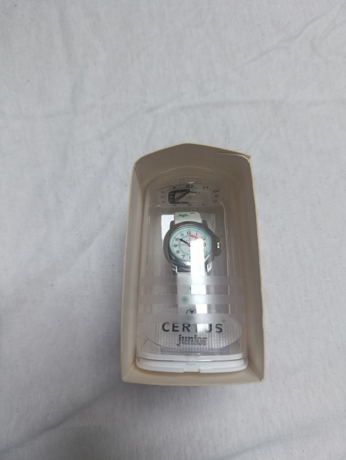 Jolie montre Certus Junior pour fille, idéale pour apprendre à lire l’heure facilement 🕒 Cadran clair avec chiffres bien visibles et repères colorés. Bracelet blanc décoré de motifs étoiles, à la fois ludique et tendance ⭐ ✨ Portée une seule fois, comme neuve 🔋 Pile à changer 💧 Étanchéité 50 m 🏷️ Marque : Certus Junior Un accessoire pratique et mignon, parfait pour un premier apprentissage de l’heure ou pour faire plaisir 🎁 ⏳ À saisir rapidement ! 👉 Envoi rapide 📦 👉 Retrouvez d’autres articles dans mon dressing