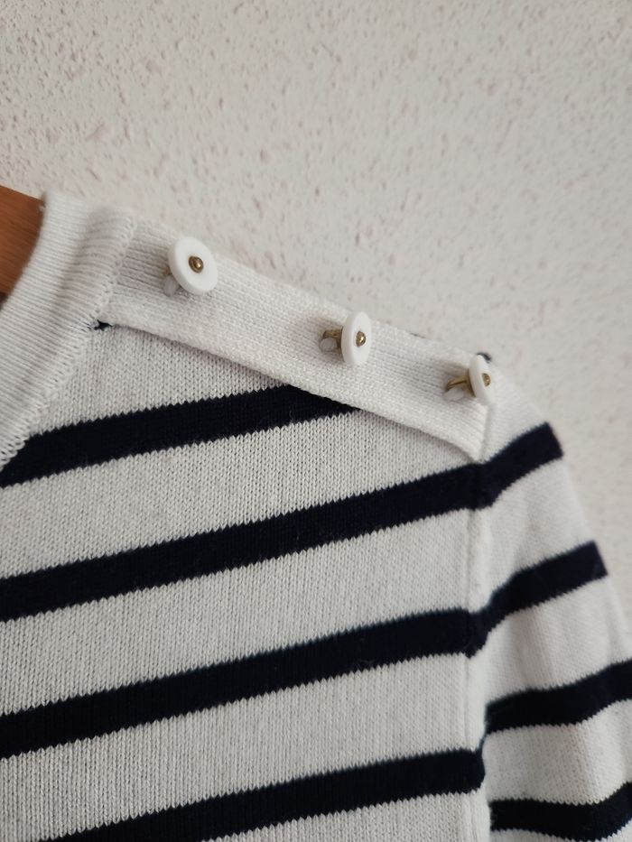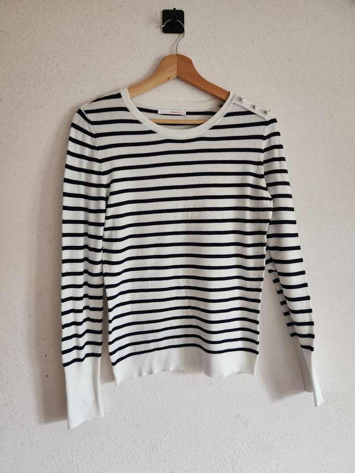 Pull fin Camaïeu à rayures style marinière, intemporel et facile à porter. – Marque : Camaïeu – Taille : M – Couleur : blanc et rayures bleu marine – Maille fine, agréable – Col rond – Boutons décoratifs à l’épaule – Bon état général Se porte facilement avec un jean, un pantalon blanc ou une jupe pour un look chic et casual. Maison non-fumeur. Envoi rapide et soigné. #camaieu #pullfemme #mariniere #taillem #basique