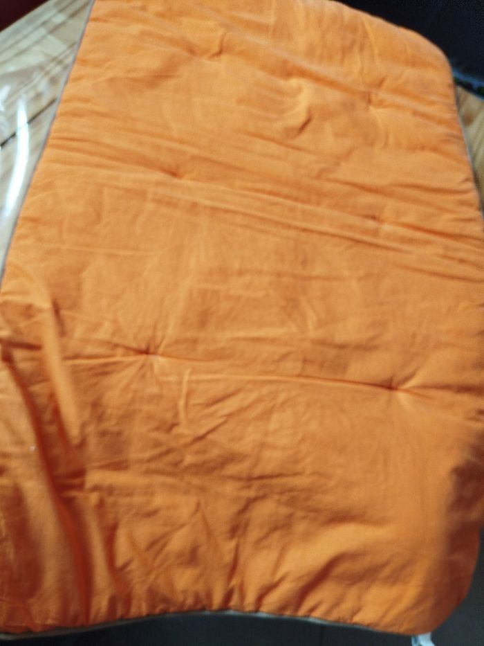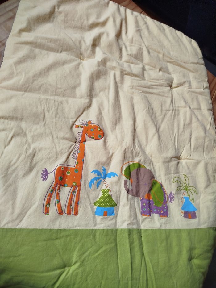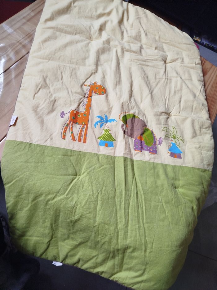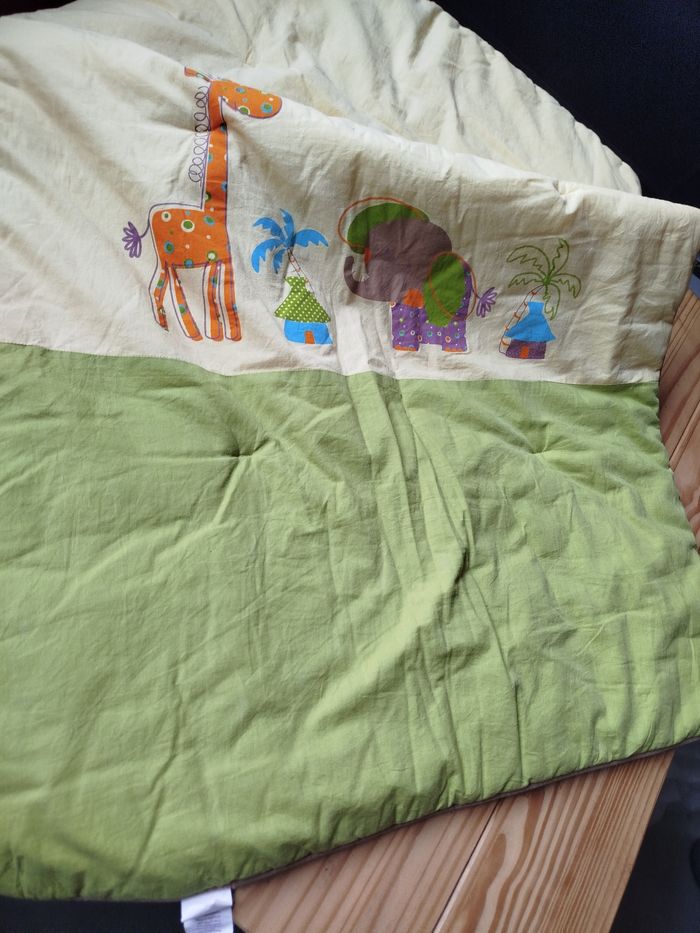 Couverture bébé marque p'tit Basile couleur vert et jaune motif Afrique arrière couleur orange