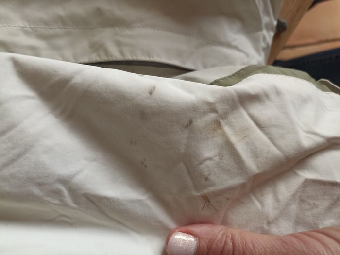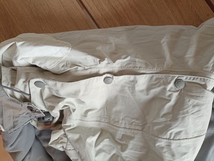 Blouson de ski Blanc crème Bordures kaki sur les manches Pare neige Capuche amovible Chaud et imperméable Taille L Petites tâches sur une manche voir photo Bon état