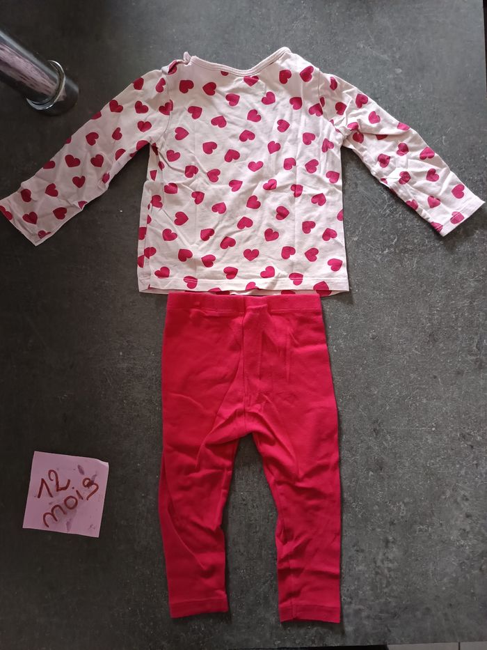 Ensemble ou pyjama en coton 2 pièces : - 1 haut rose clair avec coeurs fushia - 1 pantalon fushia Très bon état Taille 6/12 mois écrit sur l'étiquette mais plutôt 12/18 mois (74/80cm)