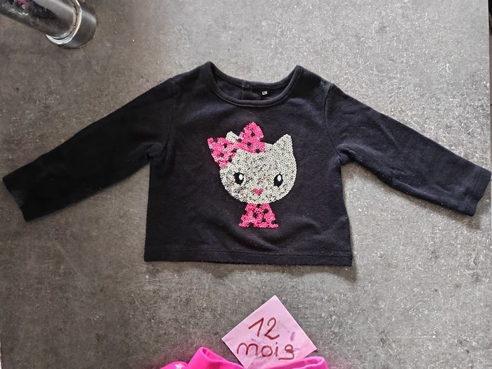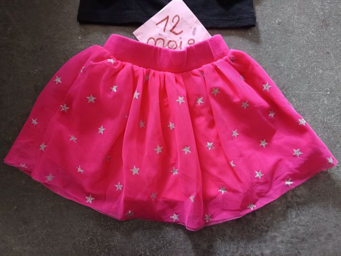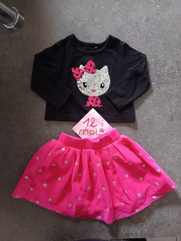 Ensemble 2 pièces : - 1 t-shirt noir manches longues avec hello Kitty en strass - 1 jupe rose fushia avec étoiles dorées Très bon état Taille 12 mois