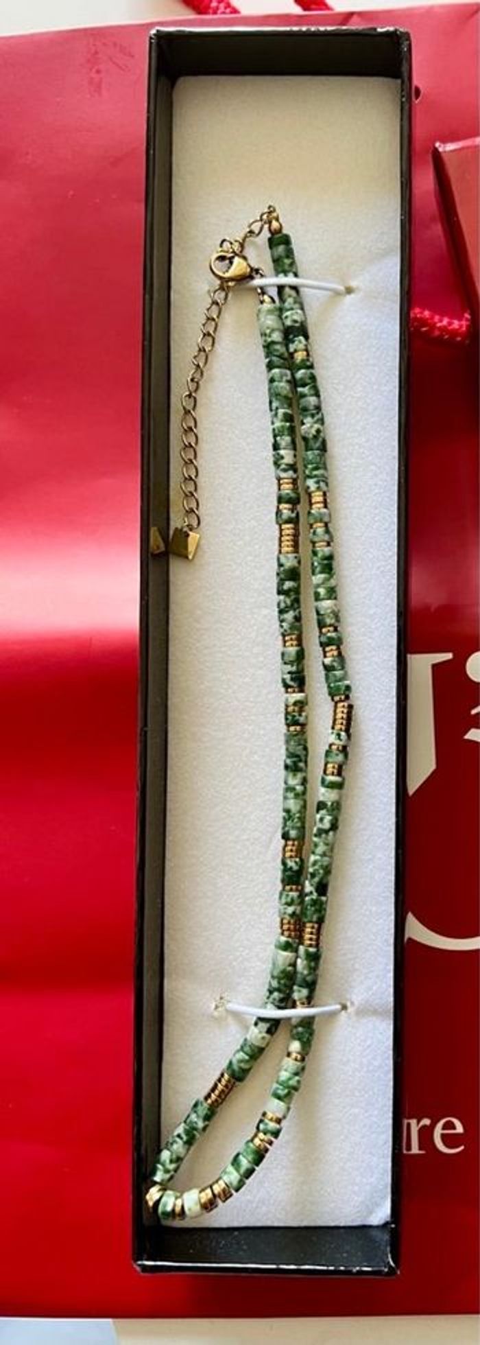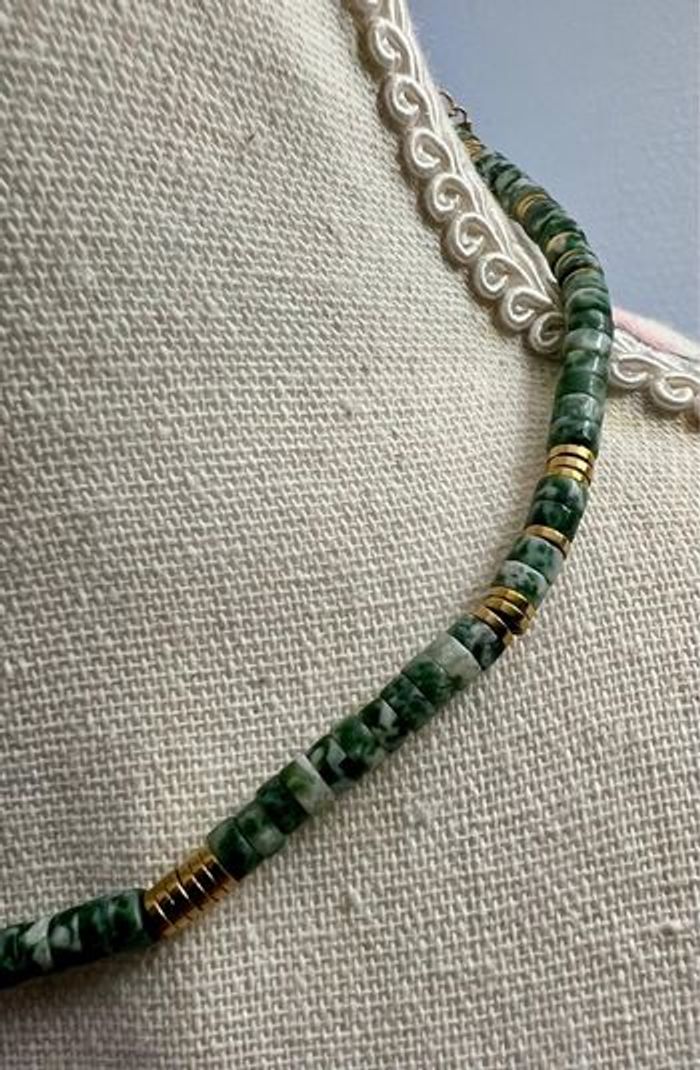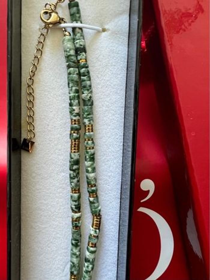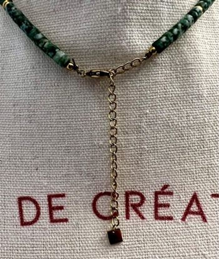 Collier composé de perles style jaspe vert, de perles dorées et d’éléments en acier inoxydable S. Steel. Monté sur un fil solide avec une chaîne d’extension dorée. Modèle résistant à l’eau : ne noircit pas, ne ternit pas. ‼️ sans boîte d’origine Détails : • Ras-du-cou réglable • Perles et finitions en acier inoxydable doré • Fermoir mousqueton + chaîne d’extension • Jamais porté 📩 Mondial Relay préféré (envoi plus rapide & sécurisé)