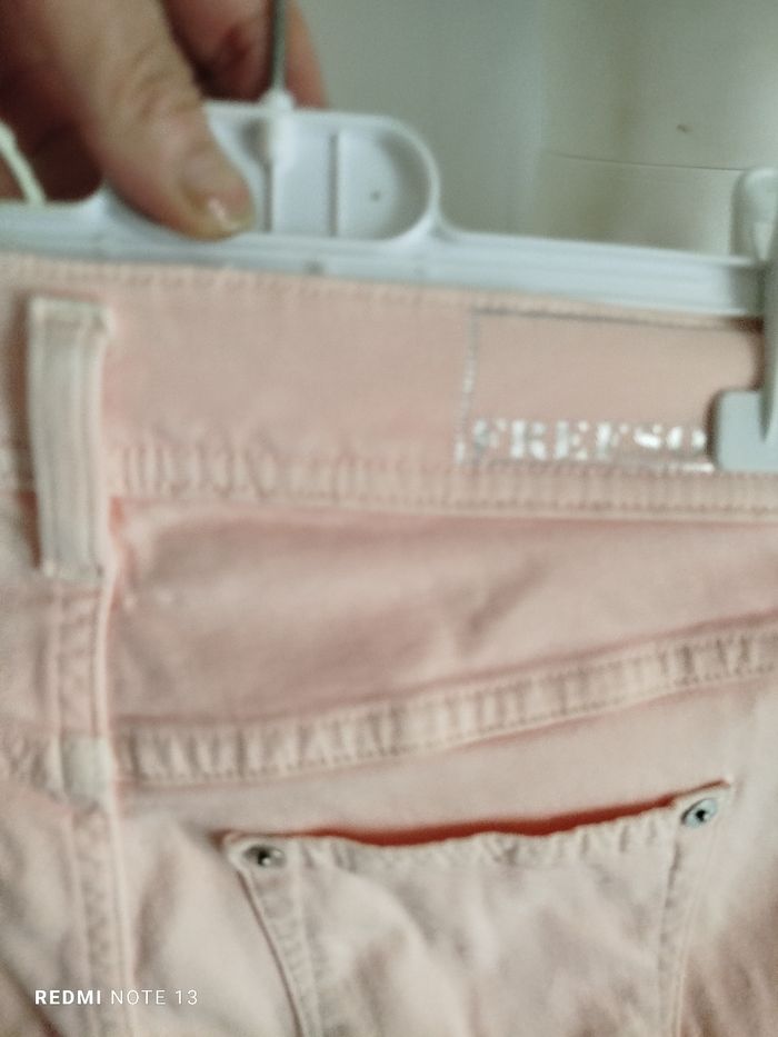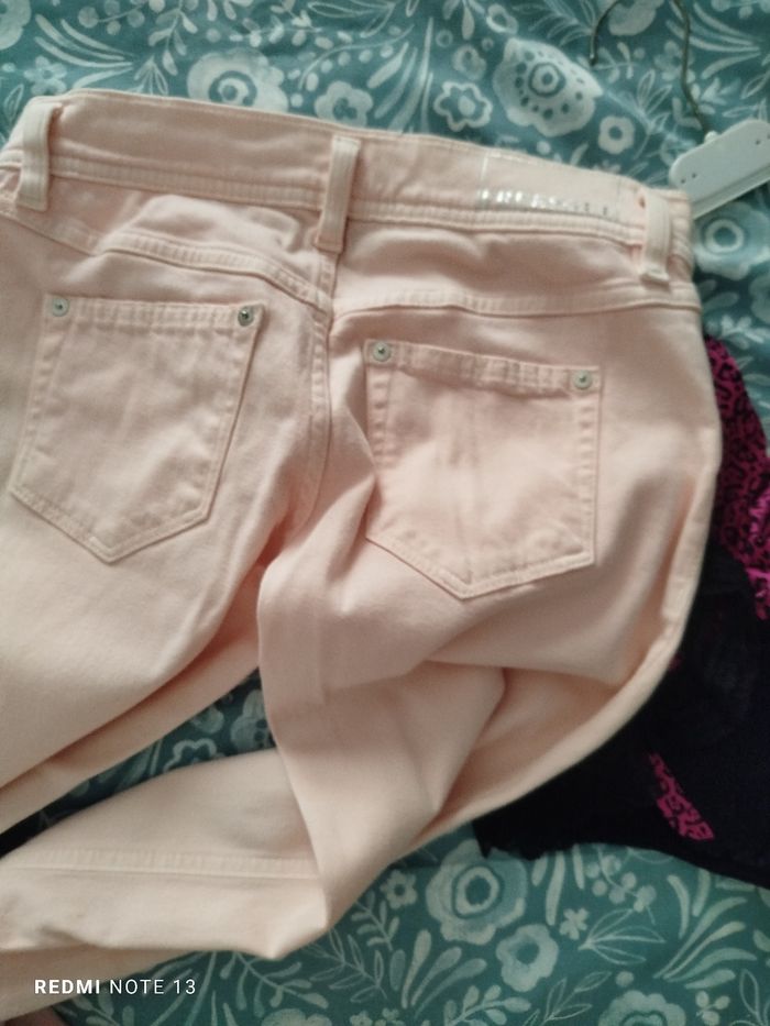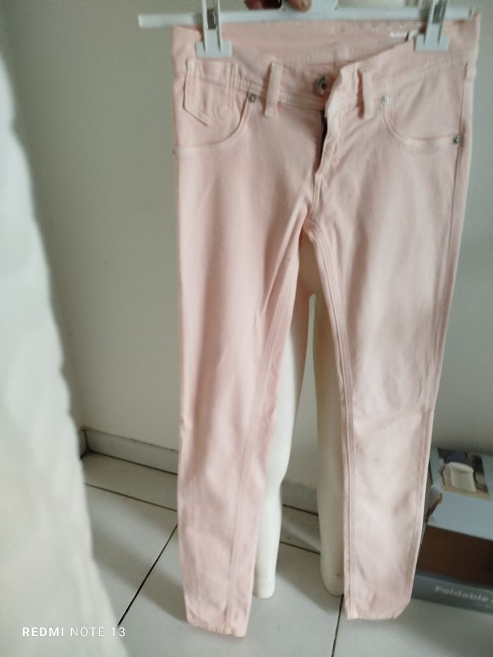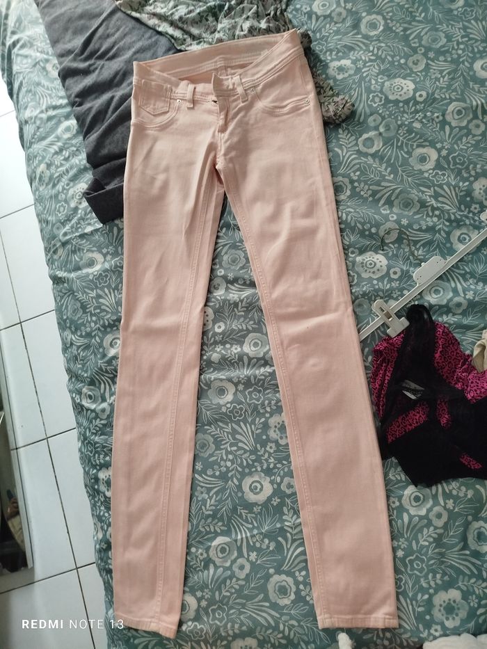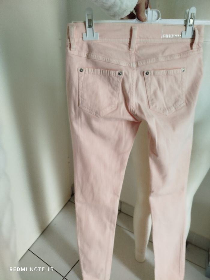 #kytie34femme. Skinny slim taille 34 de marque Freesoul fausse poche avant vrai poche arrière 93 % coton 5 % polyester 2 % élastique mesure de la taille 34 cm tour de cuisse 45 cm hauteur 102 cm en état neuf de couleur rose pastel ref 43