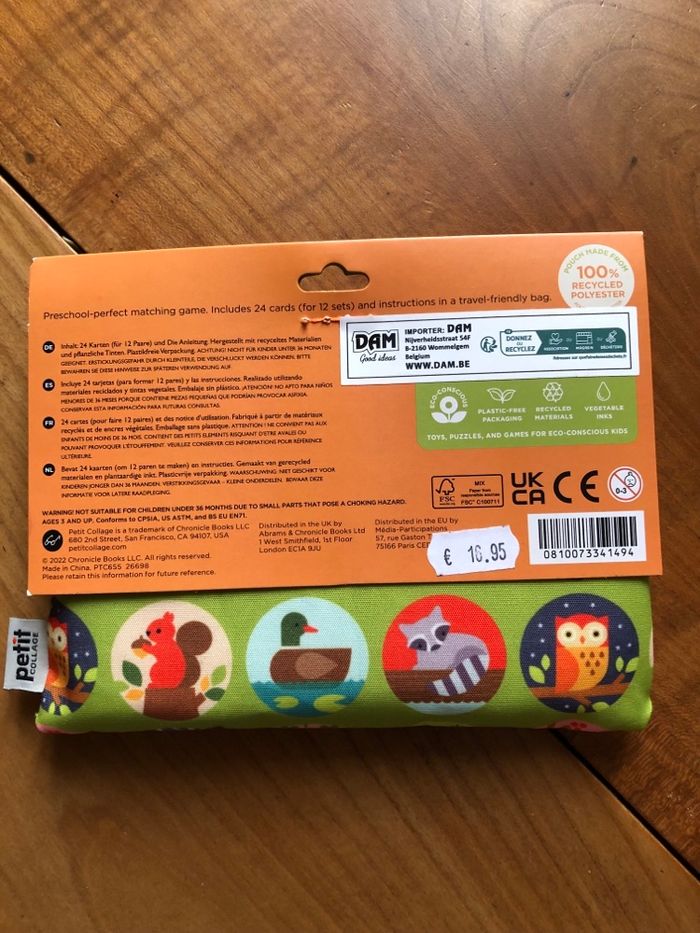 Jeu de société « Matching Game » de la marque Petit Collage. Il s’agit en fait d’un loto des animaux / memory, mais version écolo ! Petit Collage est une marque engagée qui combine une esthétique moderne avec un critère de durabilité (carton recyclé, encres végétales, bois FSC, etc.) Prix public : 17,95 €. Article neuf. Envoi rapide et soigné ! De nombreux autres produits de la marque sont disponibles dans mon dressing !