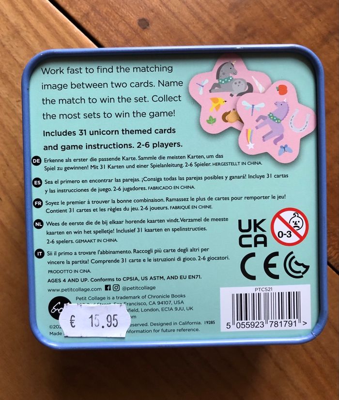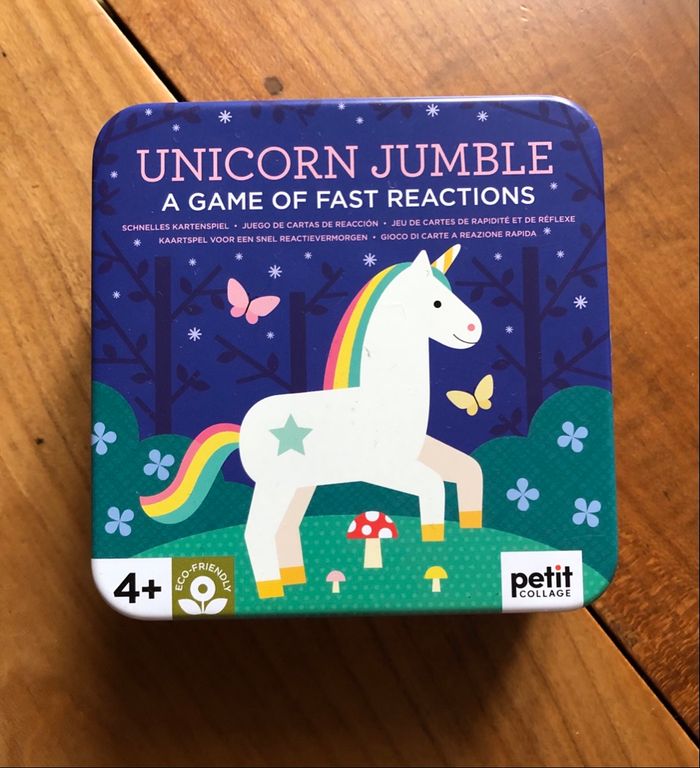 Jeu de société, de rapidité « Unicorn Jumble » de la merveilleuse marque Petit Collage. Il s’agit en fait d’un jeu reprenant le principe du Dobble. Petit Collage est une marque engagée qui combine une esthétique moderne avec un critère de durabilité (carton recyclé, encres végétales, bois FSC, etc.) Prix public : 15,95 €. Article neuf. Envoi rapide et soigné ! De nombreux autres produits de la marque sont disponibles dans mon dressing !