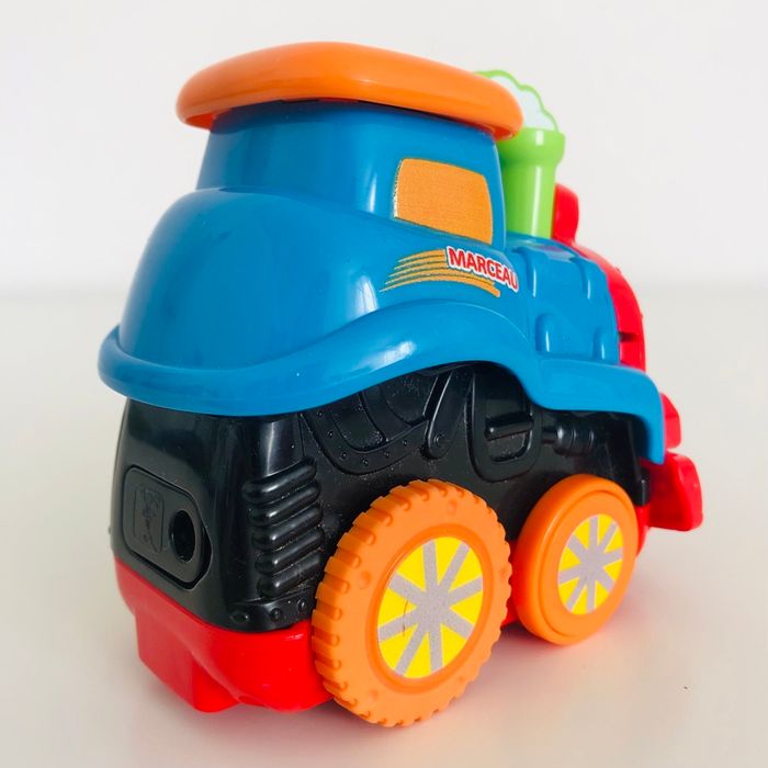 Je vends un véhicule interactif tutut bolide « Marceau Train rapido ». Lorsqu’on appuie sur le bouton sur le côté, la cheminée bouge. Lorsqu’on appuie sur le train et qu’on lâche, ça le fait avancer. Musique, sons et lumière. Piles non fournies.