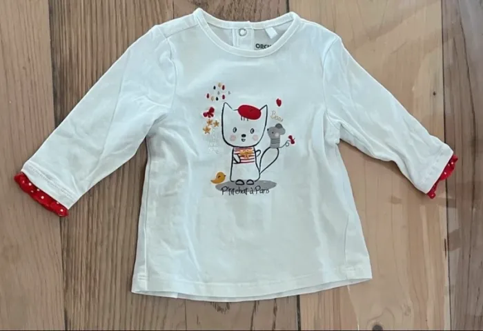Haut manches longues Orchestra, taille 3 mois, blanc avec petit chat imprimé. Très bon état, craquant et doux. 🌿 Maison non fumeur. ➡️ Envoi rapide et soigné. 💶 Prix négociable dans la limite du raisonnable #3moisfille #hautmancheslongues #orchestra #3moisfilledressingombelinedim