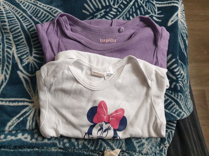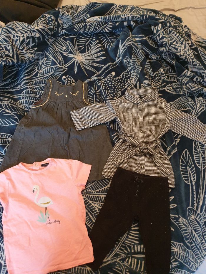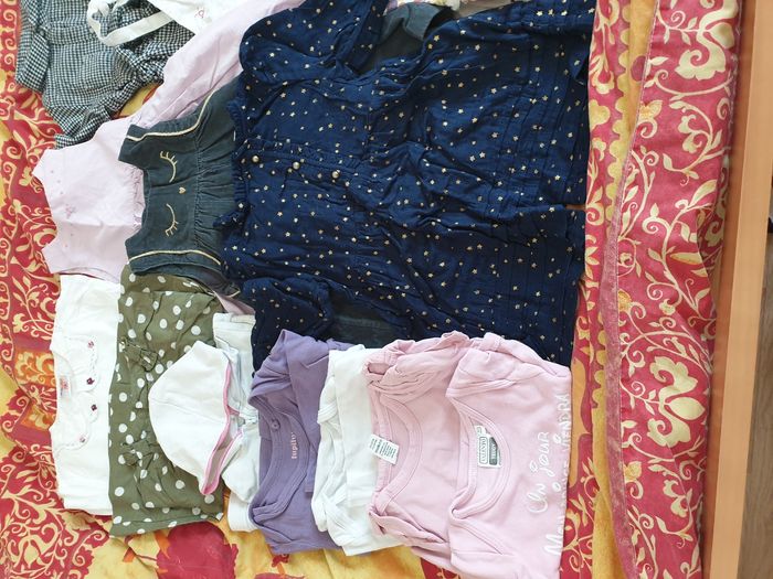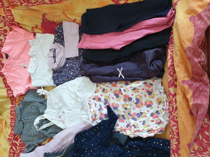 L'ensemble est en parfait état, pièces neuves ou portées une seule fois pour la plupart. Inclus : 2 chemisiers 100 % coton dont 1 jacadi et 1 imaho (broderie fait main de Madagascar) 1 sweat zippé en coton "port aventura" 2 bodies manches longues en coton dont 1 lupilu et 1 Disney (Minnie) 2 bodies manches courtes en coton dont 1 roly et 1 valento avec message humoristique 3 robes en coton dont 1 jacadi, 1 en velours kiabi et 1 doublée verbaudet 1 tunique style chemisier motif pied de poule kiabi 1 salopette en lin Obaïbi 1 barboteuse en coton kitchoun 1 t-shirts en coton kiabi motif flamand rose 1 sous-pull brodé sequins orchestra 1 ensemble sous-pull + pantalon déperlant hiver violet 3 leggings dont 1 h&m, 1 kiabi et 1 verbaudet Détail des pièces en photo sur demande Ma fille a pu mettre chaque pièce jusqu'à ses 18 mois, certaines pièces depuis ses 6 mois