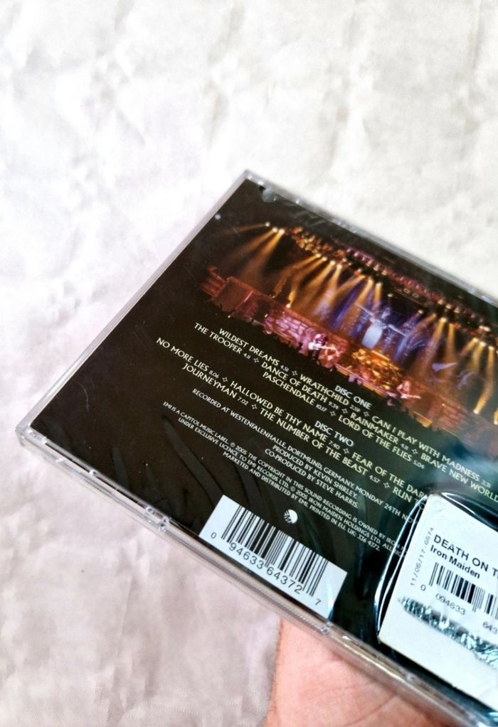 Bonjour. ​Cd jamais ouvert, sous blister d'origine. Il s'agit du double album live "Death on the Road" enregistré à Dortmund. Le scellage est intact, avec l'étiquette de prix d'époque encore présente au dos. ​Complet (Boîtier + Livret + 2 CD). ​ #ironmaiden #live #metal #collector #heavymetal
