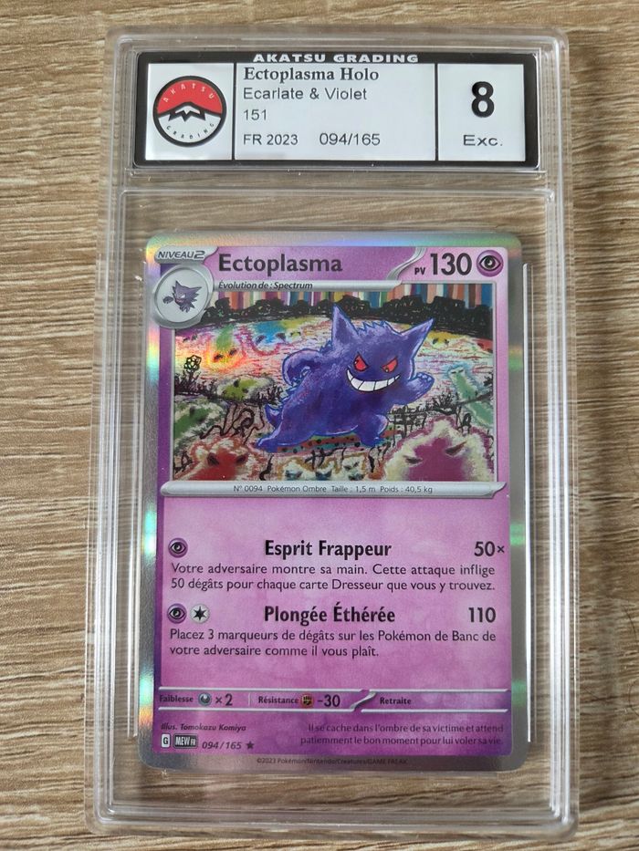 Je vends cette carte Pokémon Ectoplasma Holo, une édition limitée et gradée par Akatsu avec la note 8 Exc. - Type de produit : Carte de collection Pokémon - Personnage : Ectoplasma - Particularités : Carte Holo, Édition limitée, Gradée Akatsu 8 Exc.