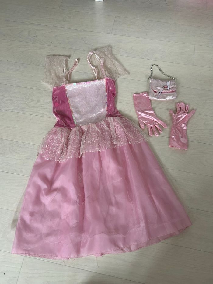 déguisement de princesse rose avec ses accessoires. -1 robe rose avec empiècements parés de paillettes. Les manches sont à améliorer (élastiques usés). Le jupon en tulle est troué devant. - 2 accessoires, gants et petit sac assorti. Taille 4/6 ans. Idéal pour quelqu’un qui saurai améliore, réparer la robe.