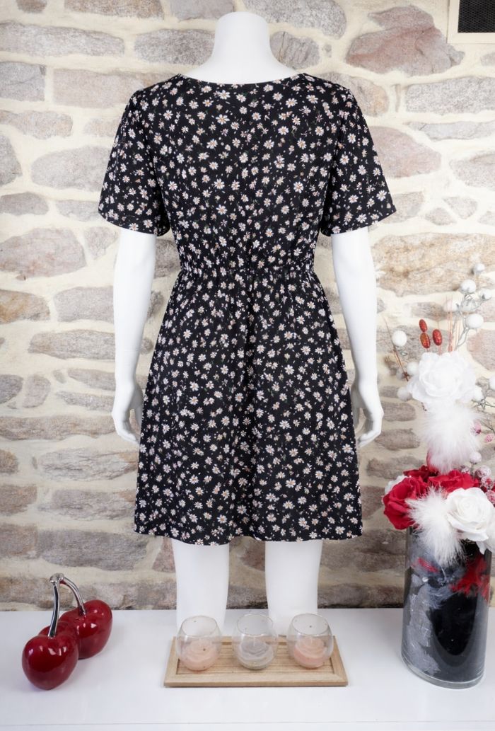 Robe champ de marguerites Femme taille 54 marque Asos ✴️ Col cache-cœur ✴️ Manches courtes bouffantes ✴️ Coupe évasée ✴️ Le motif est un semis dense de petites marguerites blanches ,jaunes/oranges discrets, le tout sur un fond noir uni ✴️ Composition => 100 % polyester ✴️ Longueur => 99,5 centimètres ✴️ Mesure épaules à épaules => 45 centimètres ✴️ Tour de poitrine => 130 centimètres