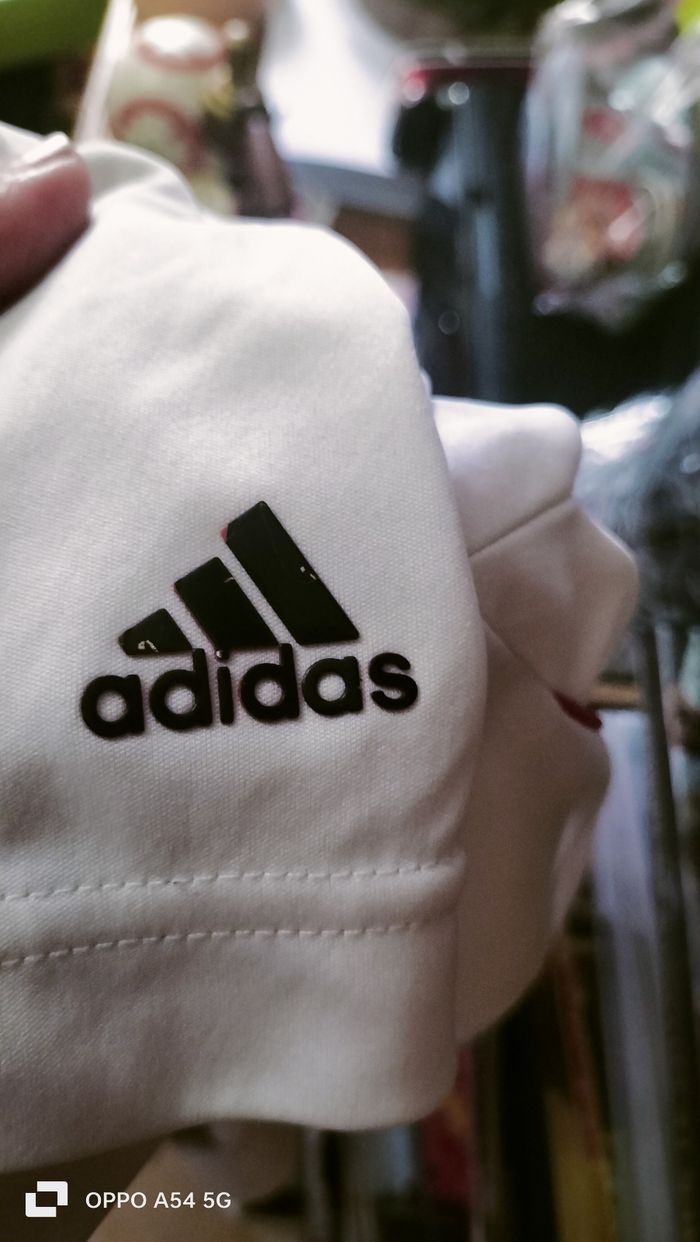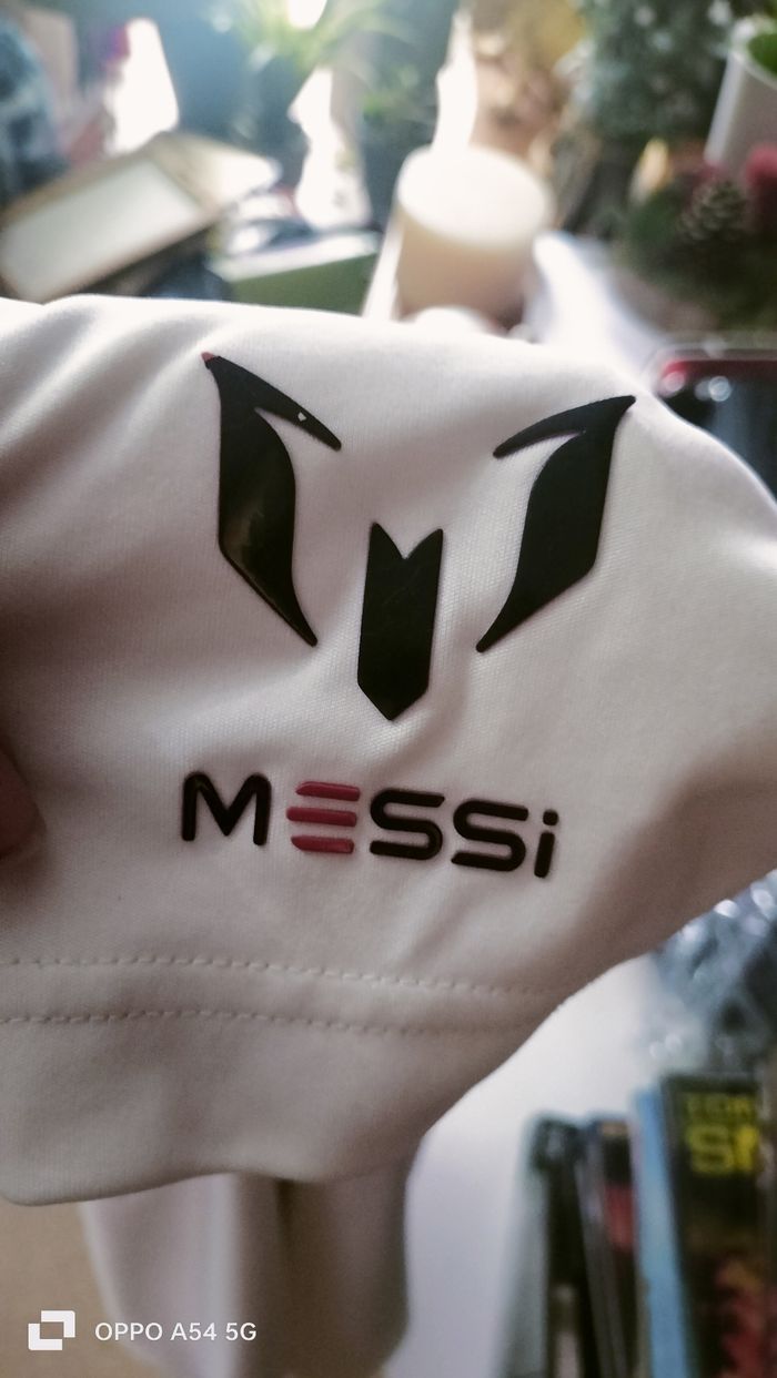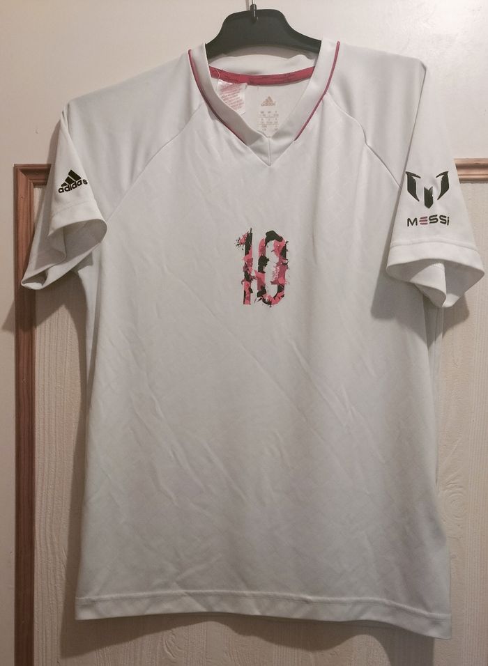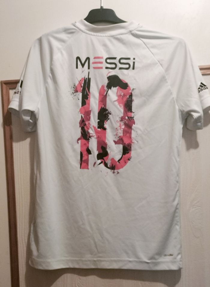 maillot de football Adidas pour enfant à l'effigie de Lionel Messi. - Type de produit : Maillot de football - Marque : Adidas - Taille : 13 / 16 ans 158 cm - Couleur : Blanc - Caractéristiques : Logo Messi, Manches courtes - Très bon état 5€