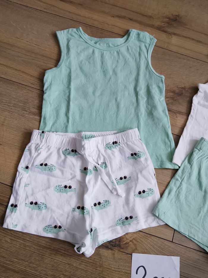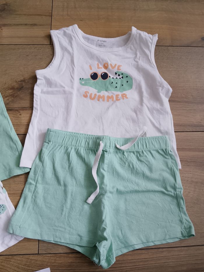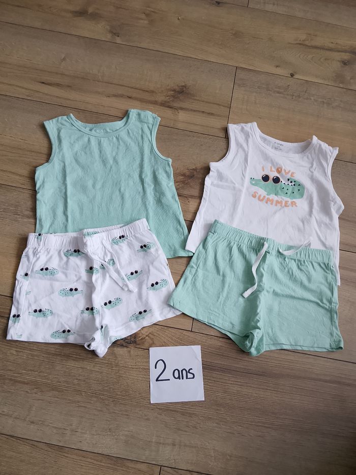 Lot de deux ensembles débardeurs et shorts pour garçon en taille 2 ans de chez Kiabi. En très bon état, sans tache ni trou. Maison non fumeur mais avec animaux.