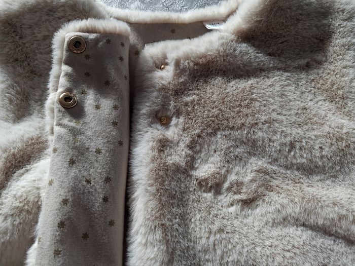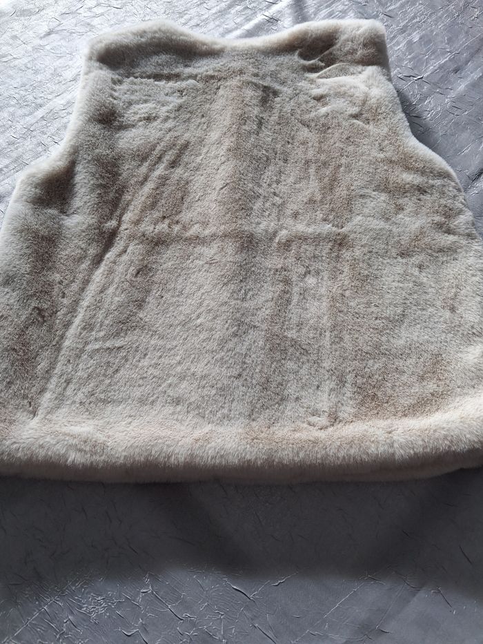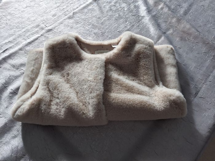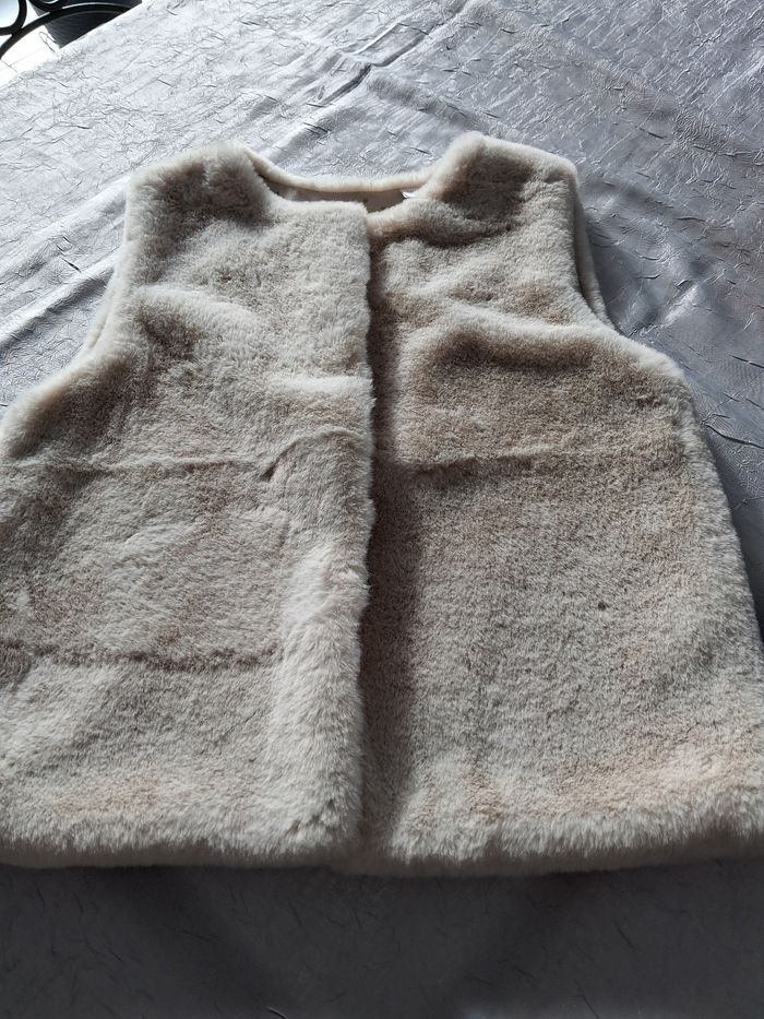 Joli veste sans manches Imitation fourrure 2 pressions Pas de poches Seul bémol le nom de ma fille sur étiquette mis un coup de blanco correcteur qui peut s'enlever .