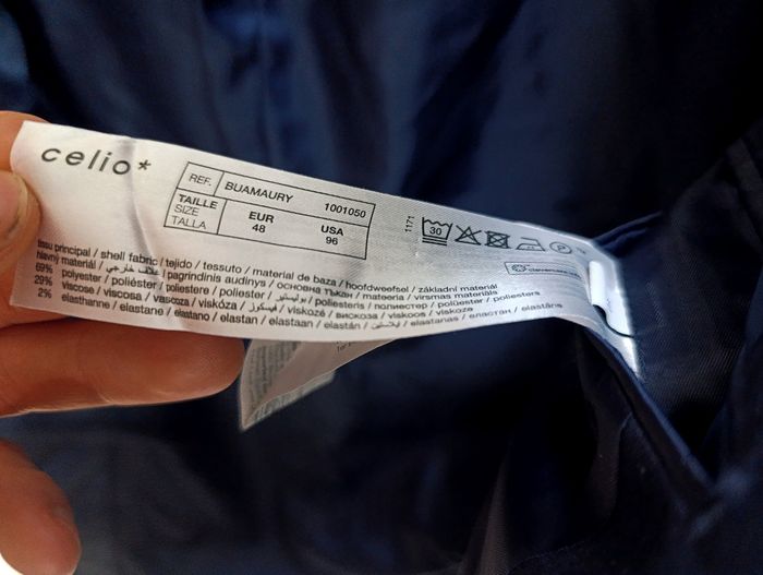 Costume Celio 2 pièces bleu marine pour homme. Essayé une fois. Taille Haut 48 / Bas 40. 69% Polyester / 29% Viscose / 2% Elasthane.